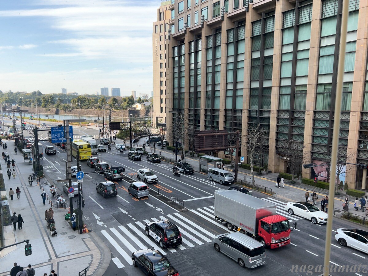 この日はラッキーなことに、4階の窓側の席に座れたので、皇居やペニンシュラなどを眺めながら。