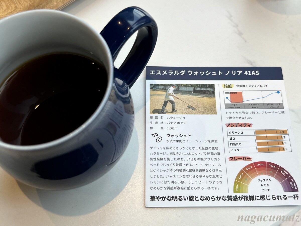 エスメラルダ ウォッシュト ノリア 41AS のホットを 1430円。結構薄めに入っていたのだが、香りは最初は柑橘系、時間が経っていくとよりピーチっぽくなった。