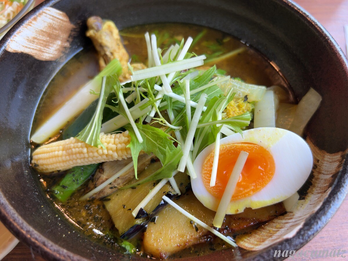 ゆで卵、チキン、野菜8種類(ヤングコーン、蕪、ゴボウ、オクラ、ブロッコリー、茄子、タマネギ、ジャガイモ)に水菜が載る。辛さは野菜の味などがわかるようにと 0~10 まであるうちの 2 の中辛にしたが、3 にしても良かったかも。