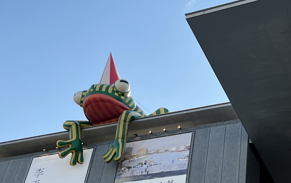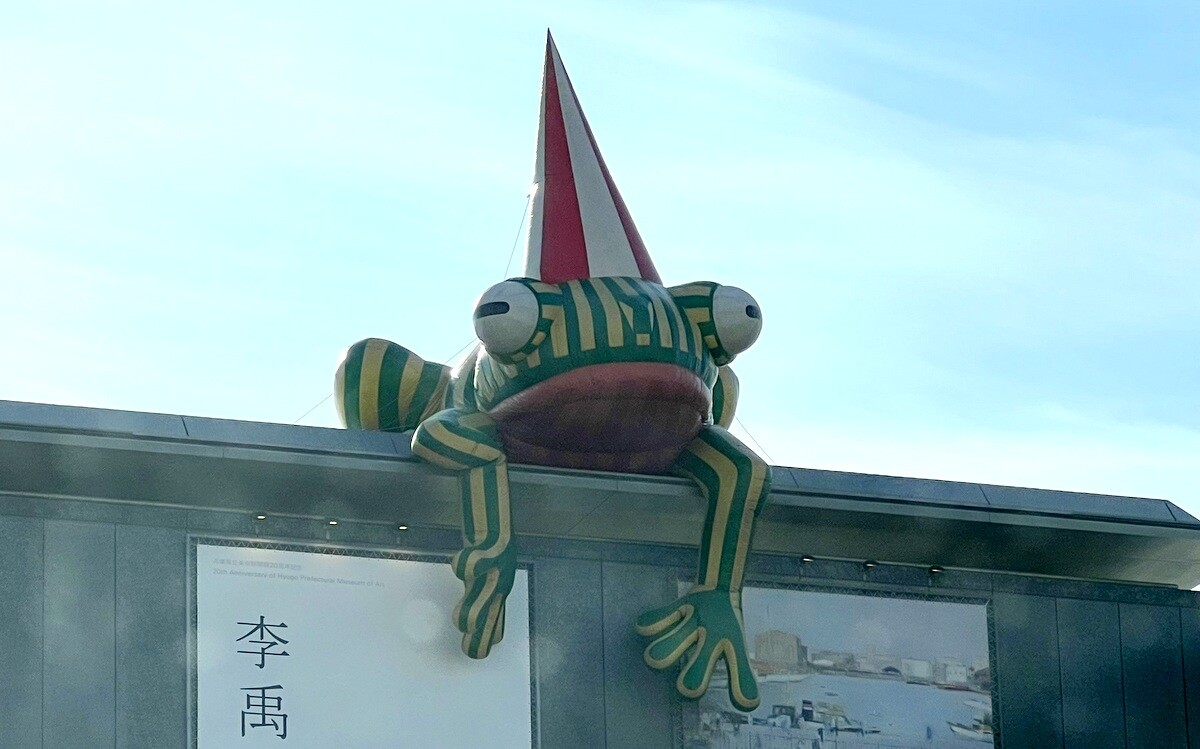 美術館の屋上に設置された高さ約8メートル、幅約10メートルのカエルのオブジェ。美かえるという名前は700 件を超える応募の中から、「かえる」という言葉が復活をイメージしやすく、阪神・淡路大震災からの文化復興のシンボルとしての美術館の設立趣旨と合うことや、「見かえる」「見にかえる」といった語呂のよさなどから決定したのだとか。