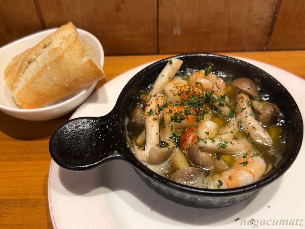 海老とキノコのアヒージョ 980円 海老がぷりぷり、にんにくはほっくり。パン100円を付けてもらった。