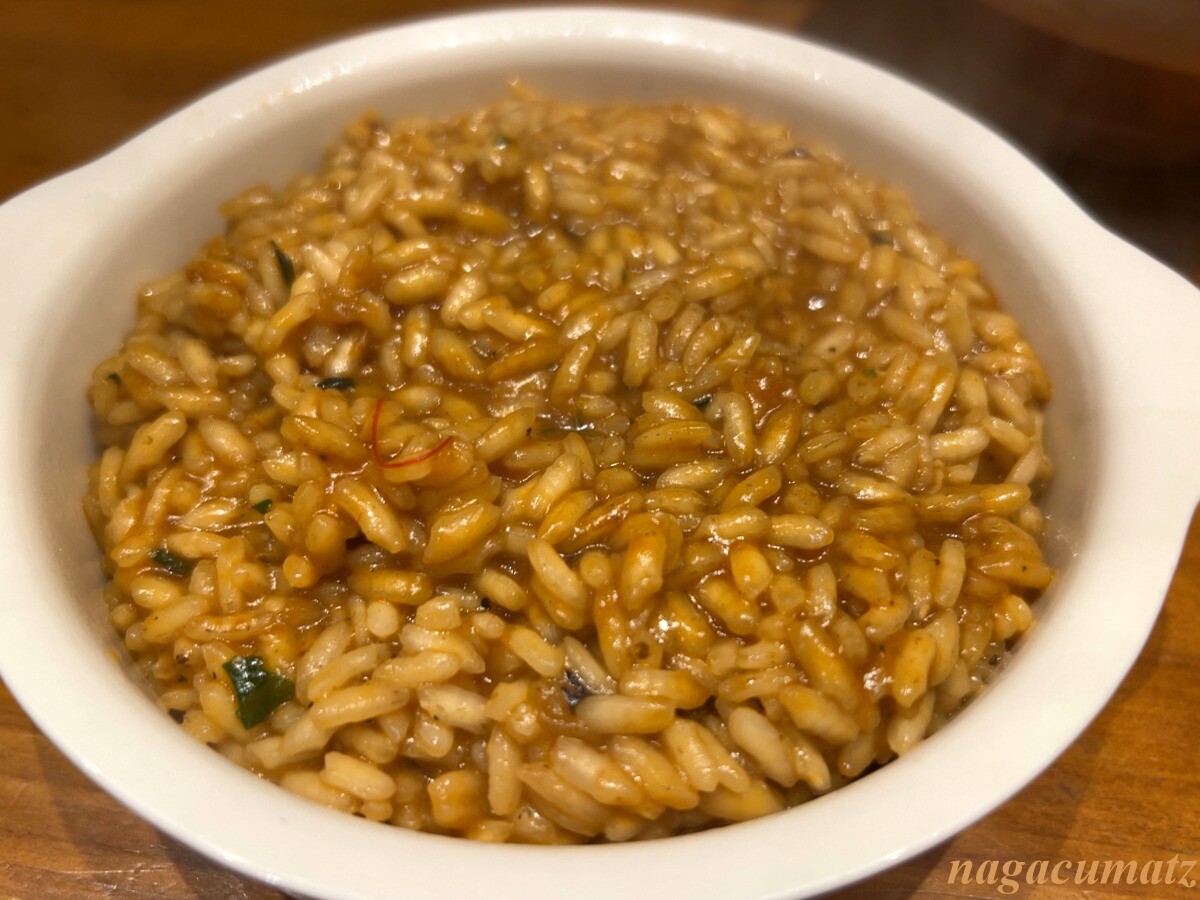 残ったスープを使ってリゾットを作っていただいた。お米はしっかりアルデンテでこれまた美味しい。サフランの香りも。器は小さいサイズをお願いしたのだが、それでも量が多かったので、残りは持ち帰りにさせてもらった。980円。