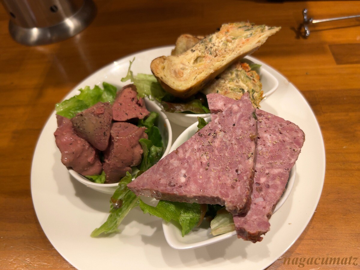 前菜の3種盛り合わせ 1310円 本日のキッシュは桜海老、自家製テリーヌ、レバーコンフィを選択。