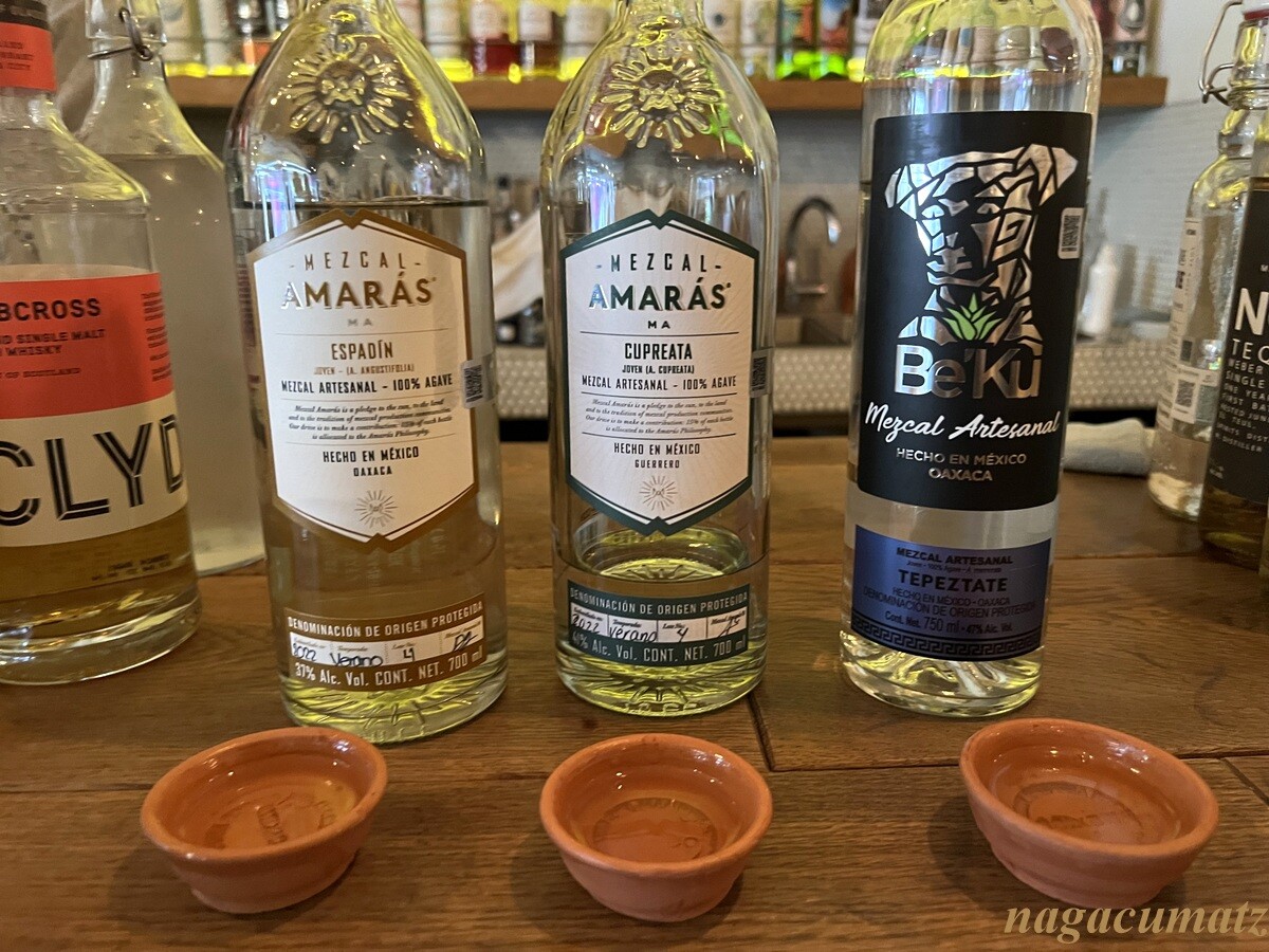 メスカルの3種類の飲み比べ。原料となるアガヴェ(リュウゼツラン)から製造する時間はそれほど長くないが、アガヴェの年数の違いによる。左から順に年数が経っているもの。やはり一番右が美味しい。