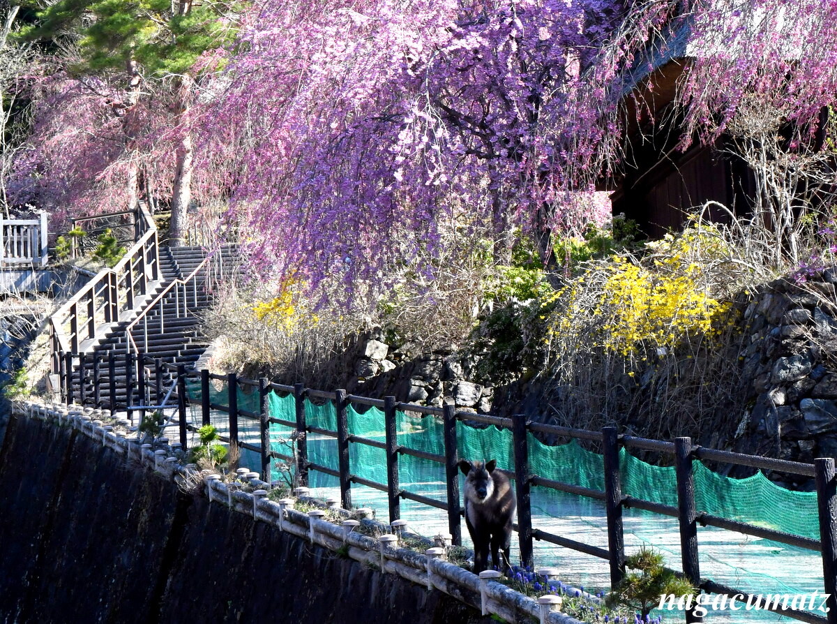 そして、シダレザクラが綺麗な西湖いやしの里へ。なんとなんと、ニホンカモシカに遭遇! ニホンカモシカと桜とのコラボとなった。