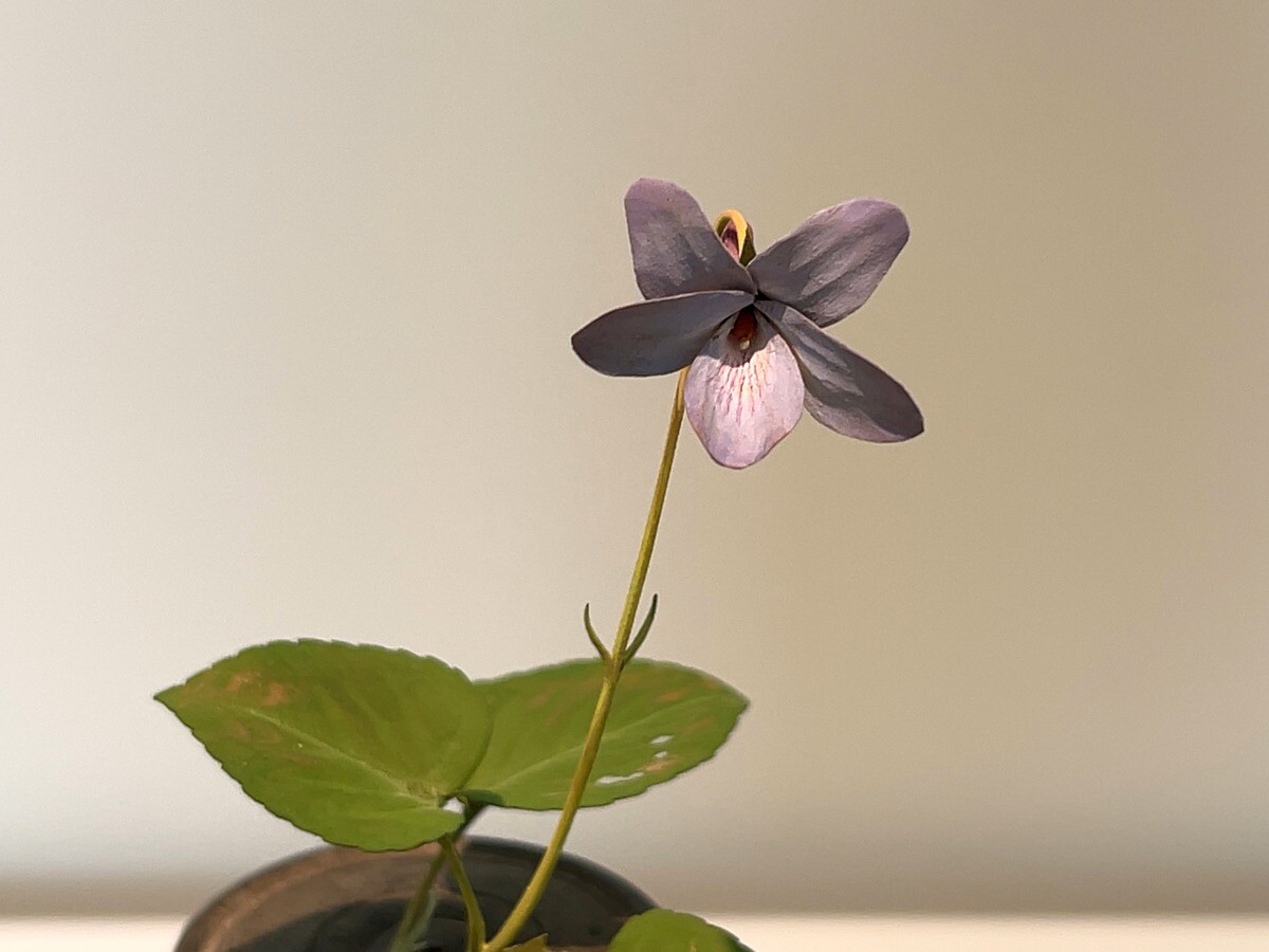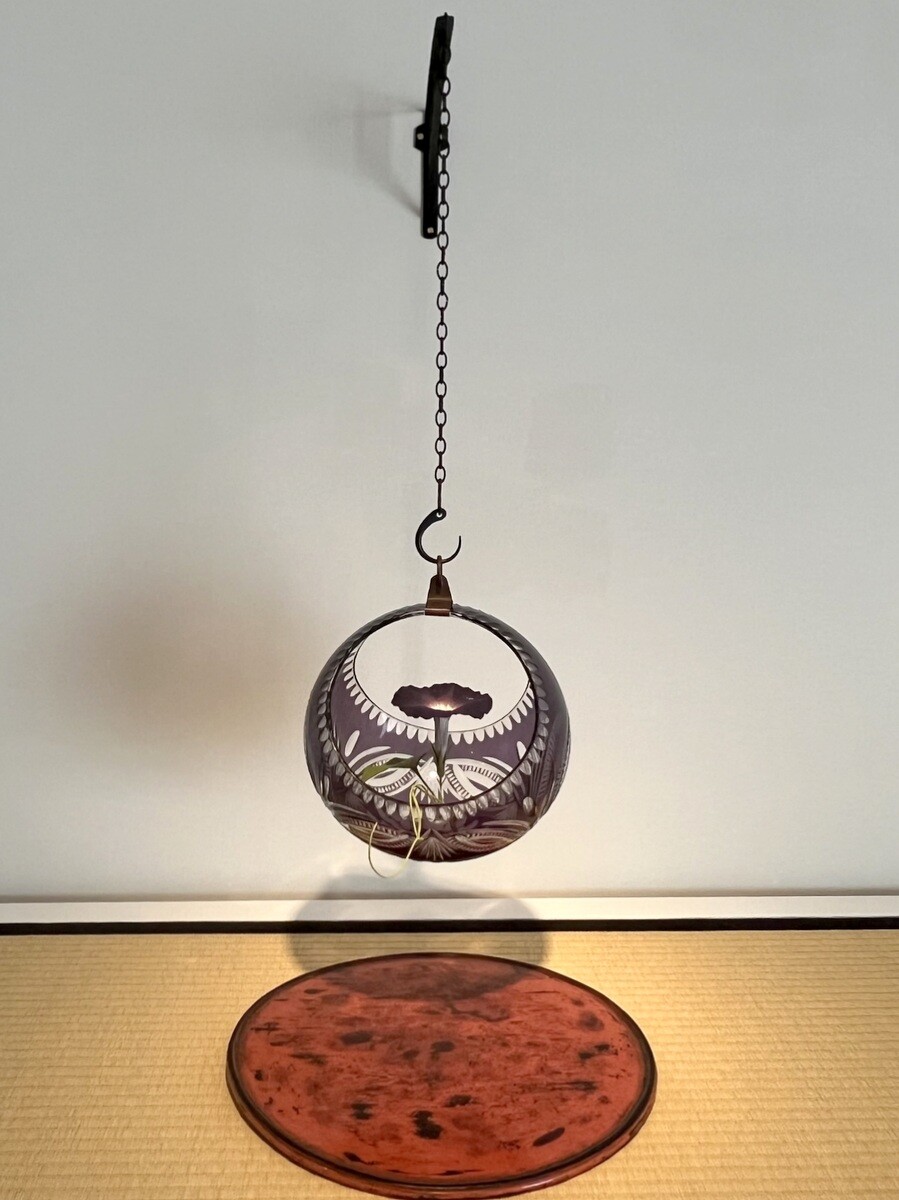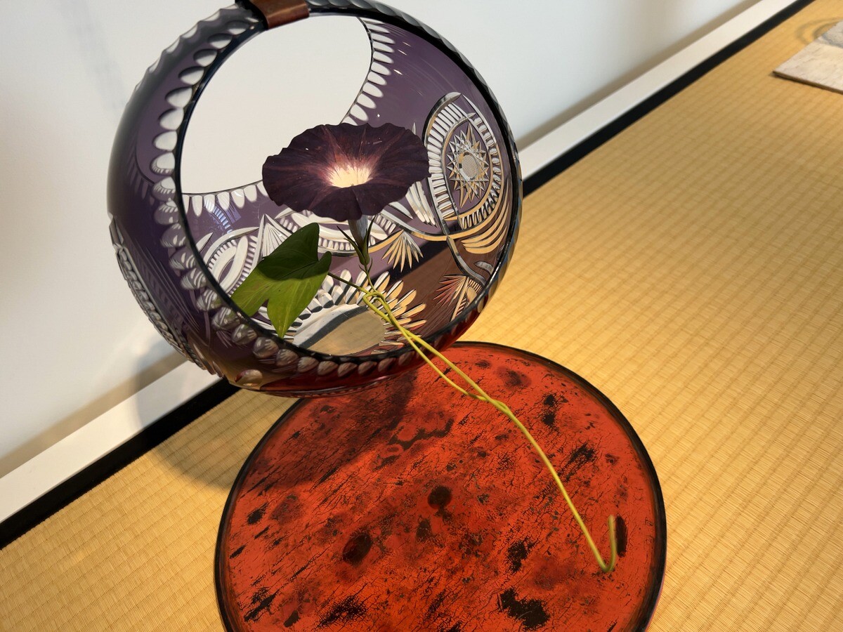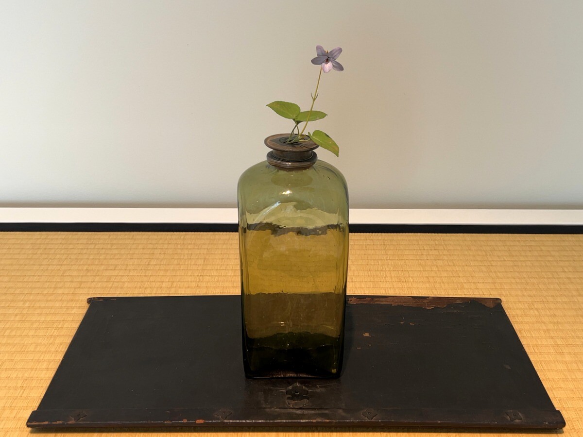 ギャラリー小柳では、杉本氏のコレクションおよび小田原文化財団所蔵の補作の作例が展示されており、硝子のジンボトルには菫が配されている。