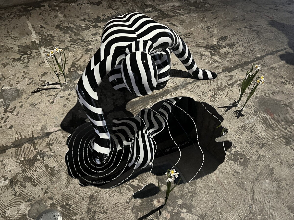 現代の我々もナルキッソスと同様、スマートフォンの画面に映る大量の情報に夢中になり、時に生活 に支障をきたす程に時間を浪費してしまっていることから、この像が覗き込んでいる鏡には、まるで水紋のように、スマホでのフォロー上位のハッシュタグ 200個が書かれている。