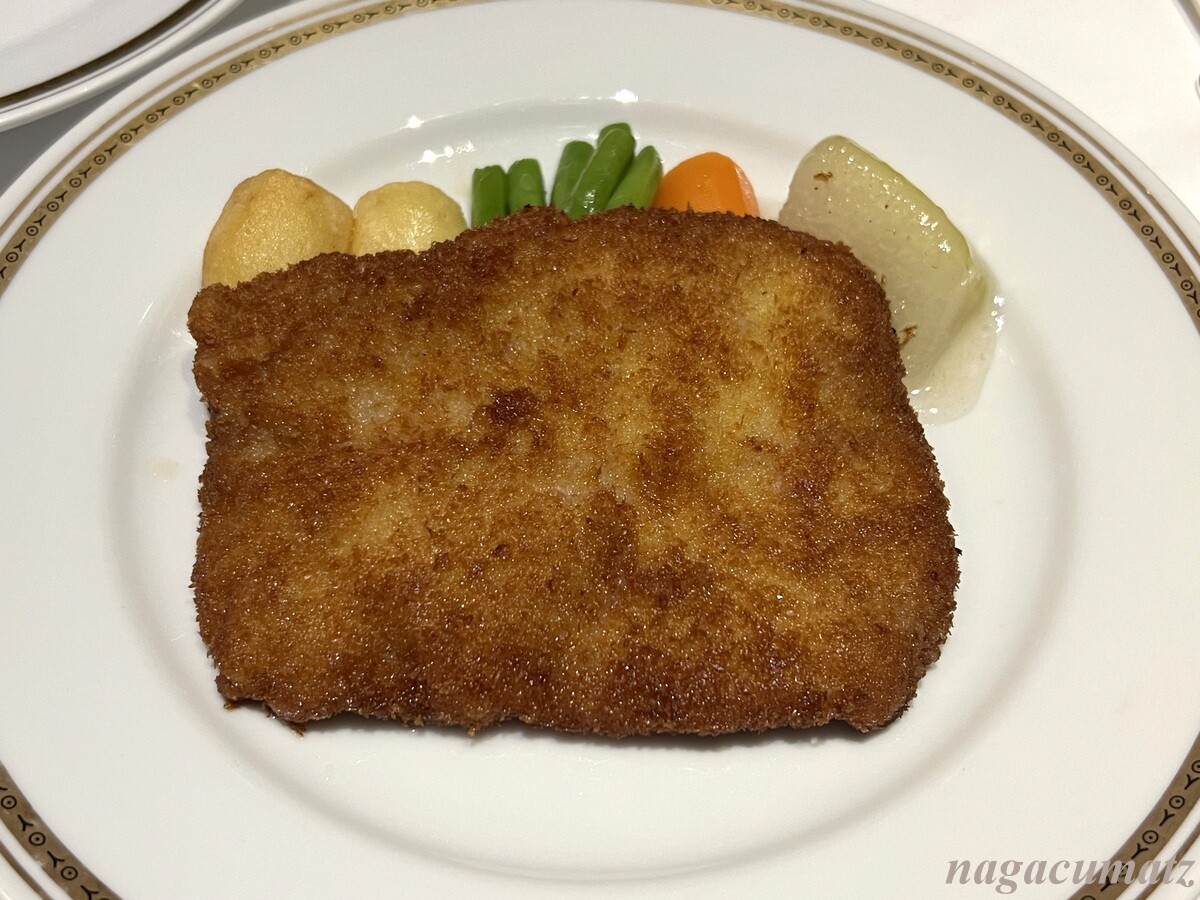 仔牛カツレット 3800円 ジャガイモ、さやいんげん、人参、大根が付く。