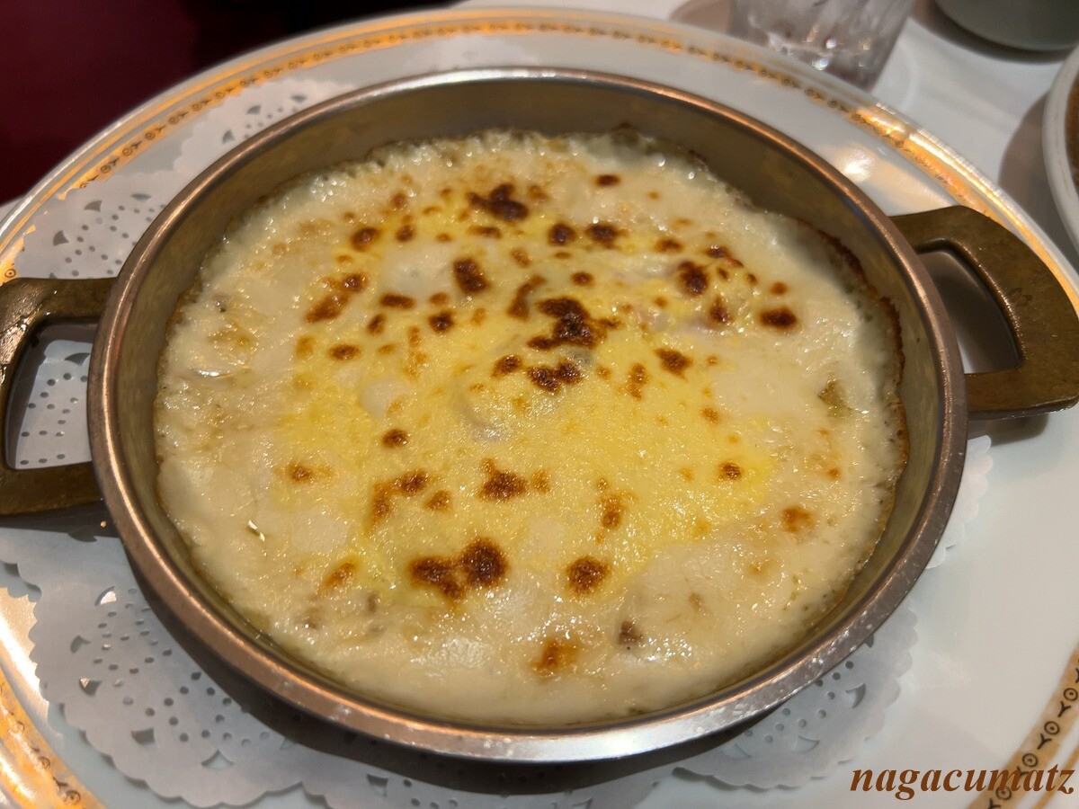 芝海老のグラタン 3200円 底に少しお米が敷いてある。芝海老のほか、マッシュルームも入っていた。