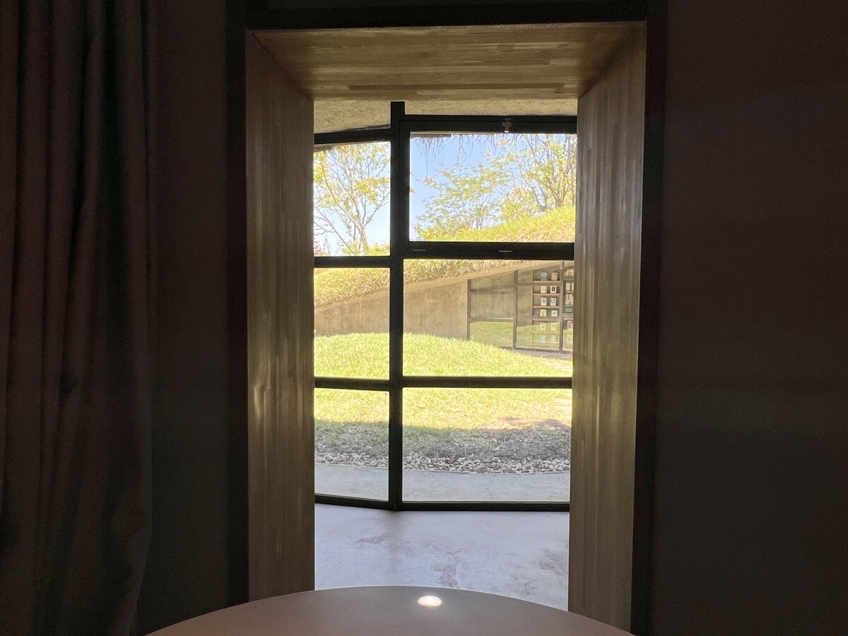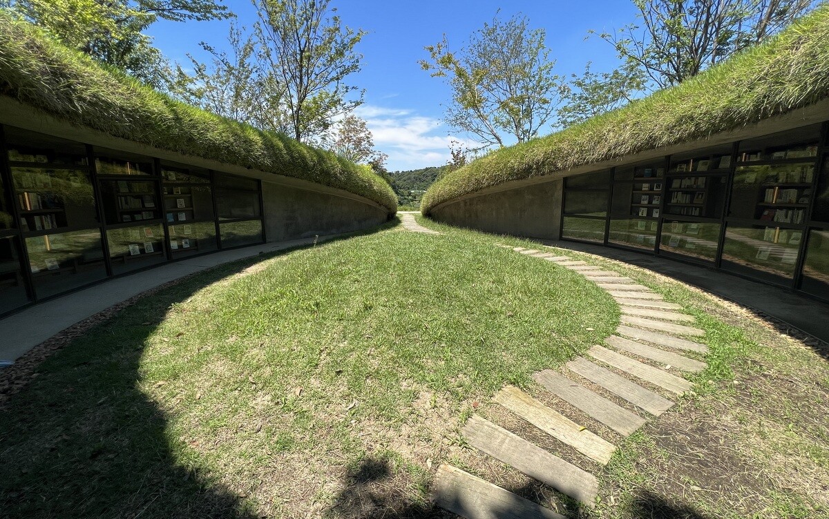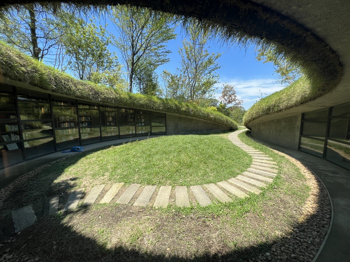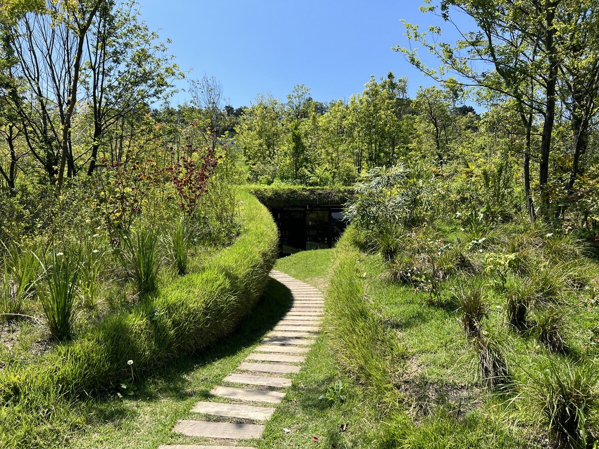 背後のこんもりした丘側にも遊歩道があるので歩いてみると、木々の間にちょっととんがった場所が。どうやら、それがホールのドーム状になった部分の明かり取りのよう。
