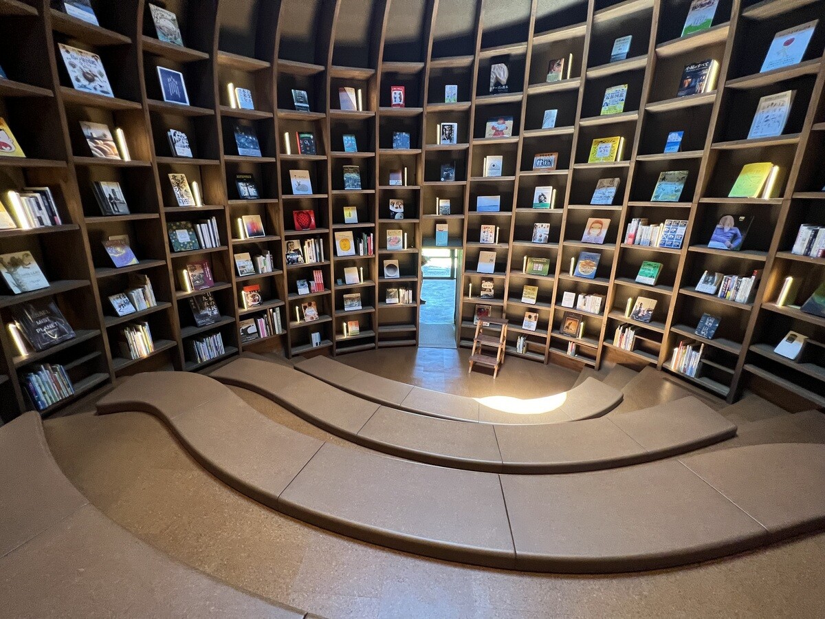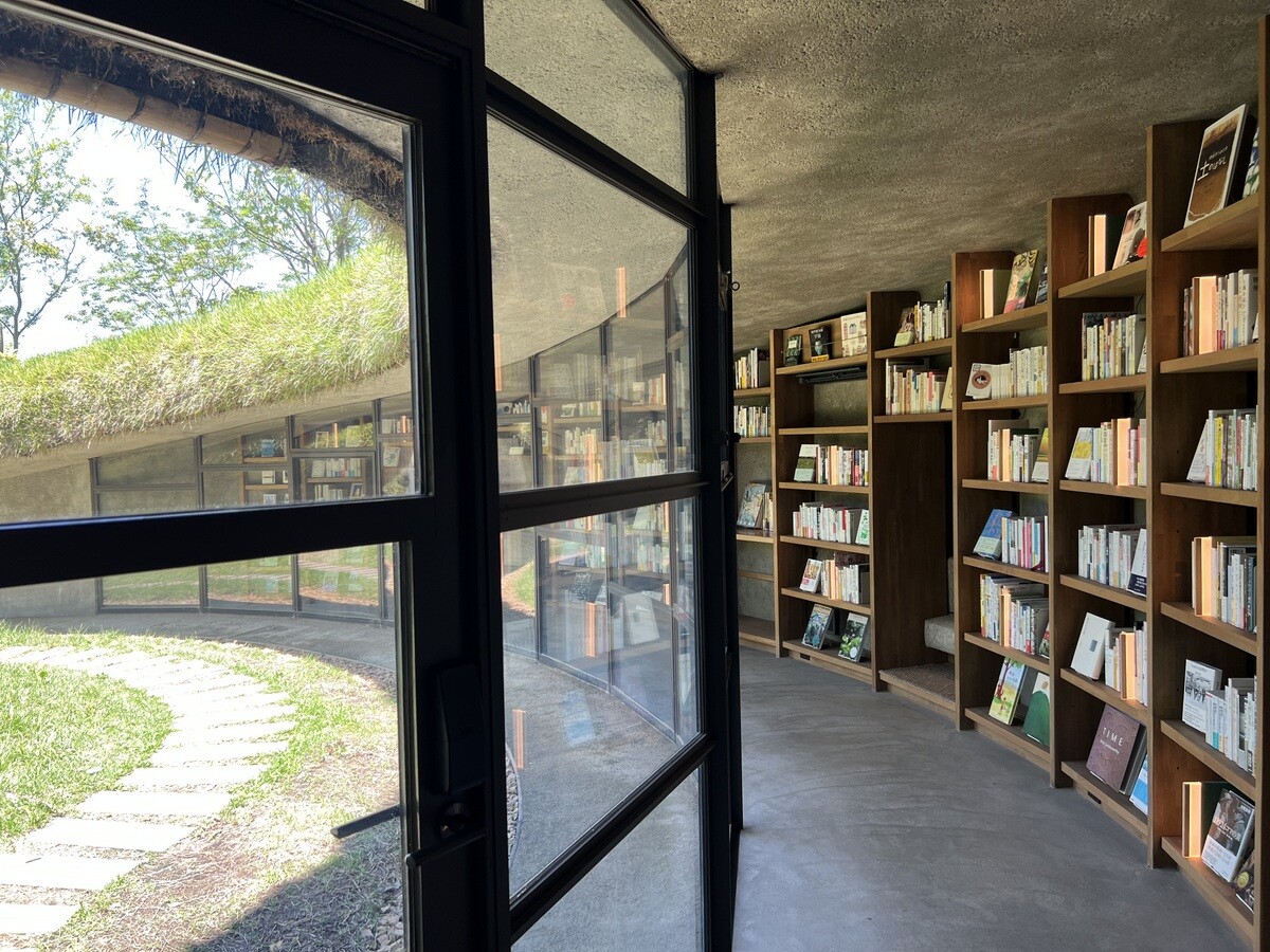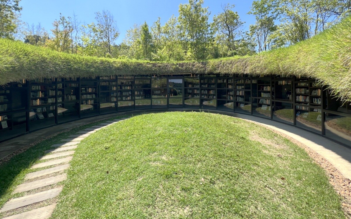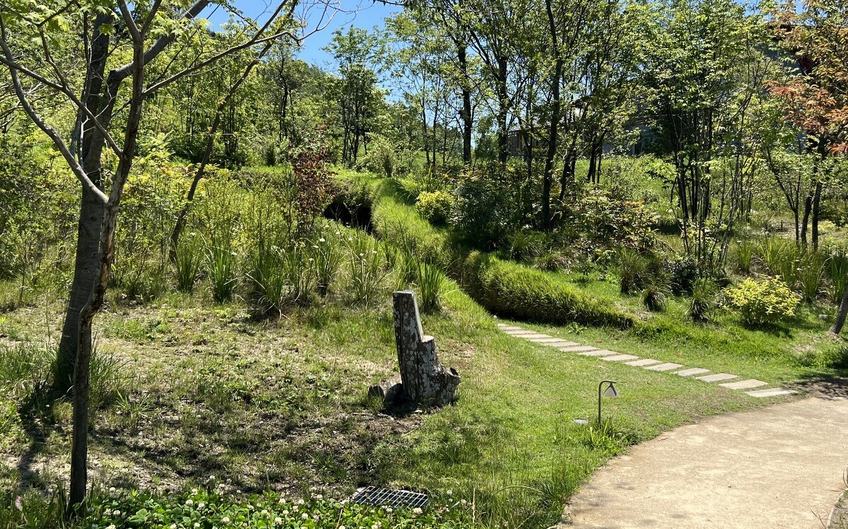 背後のこんもりした丘側にも遊歩道があるので歩いてみると、木々の間にちょっととんがった場所が。どうやら、それがホールのドーム状になった部分の明かり取りのよう。