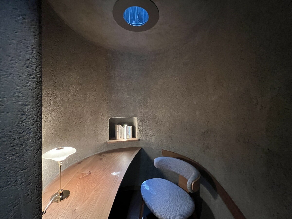 しかし分厚いカーテンが付いていて、それを締め切ってライトを消すと、天井の小さな明かりがテーブルに木漏れ日を映し出してくれると言う仕掛け。