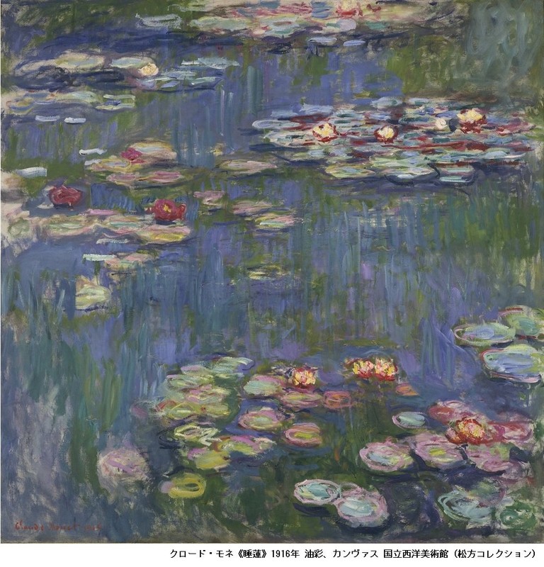 モネは生涯、睡蓮を300点近く描いており、高さ2メートルの絵画が何枚もつなぎ合わされた物がパリのオランジェリー美術館に収蔵されている。