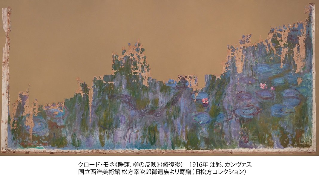 今回発見され修復された物も、同様の高さ2メートル、横4メートルで、オランジェリー美術館の連作のサイズに合い、キャンバスも一致。「朝」、「昼(雲)」、「日没」がオランジェリーにあり、松方コレクションはそれらに並ぶ夜のものだと推測されている。
