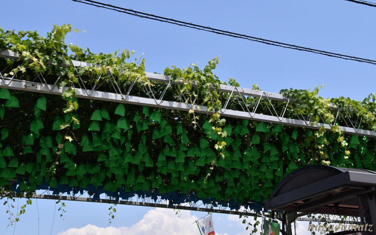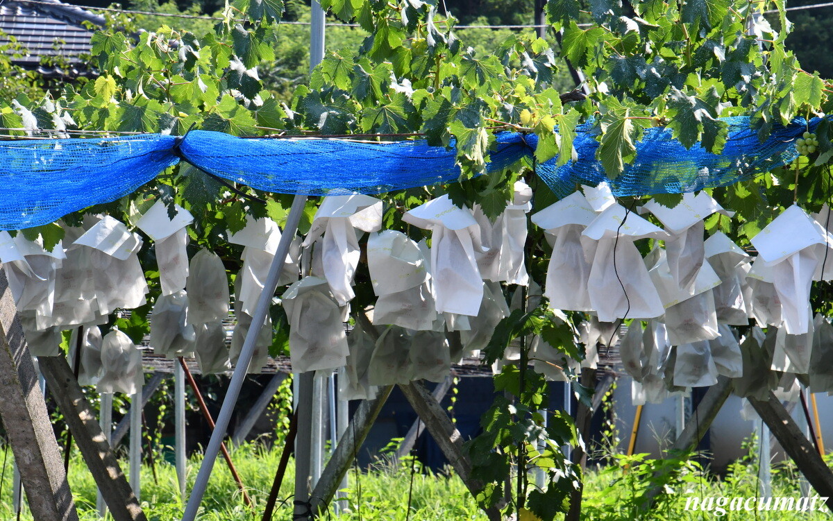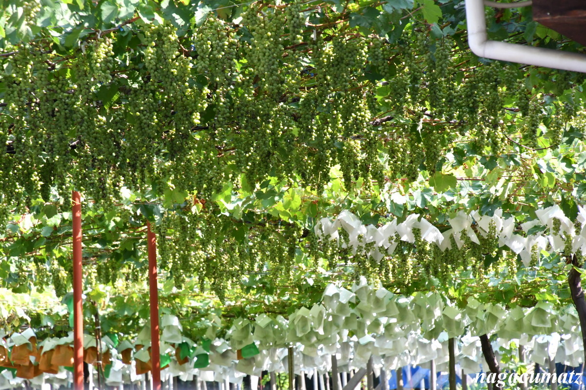 普通のブドウ畑では手の届く高さにブドウが作られているが、直売所では、ブドウの棚が電線と同じぐらいはるか高い位置になっていて、そのブドウの棚の下がお店やパーキングに。袋がけなどは大変だろうなと。
