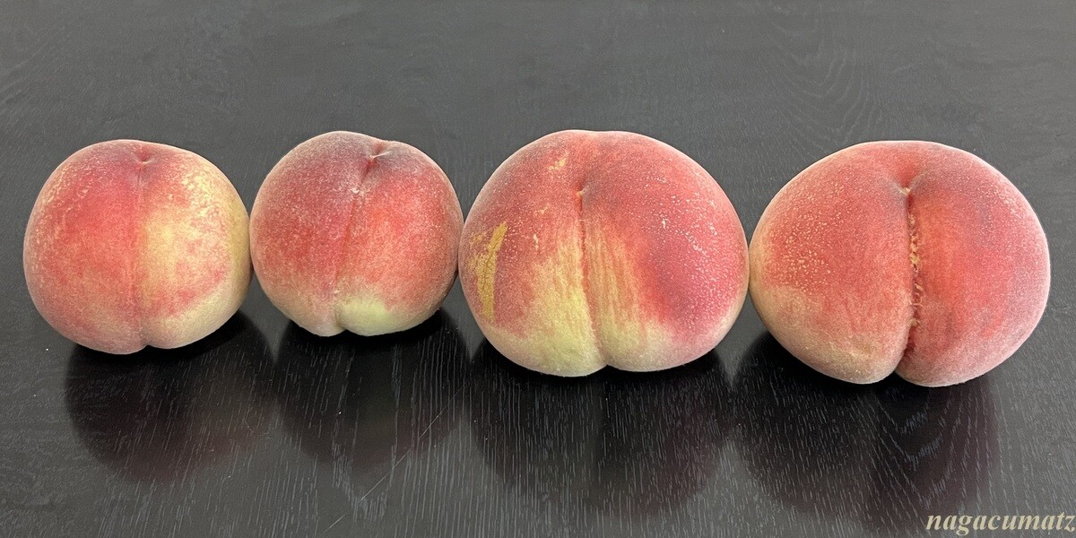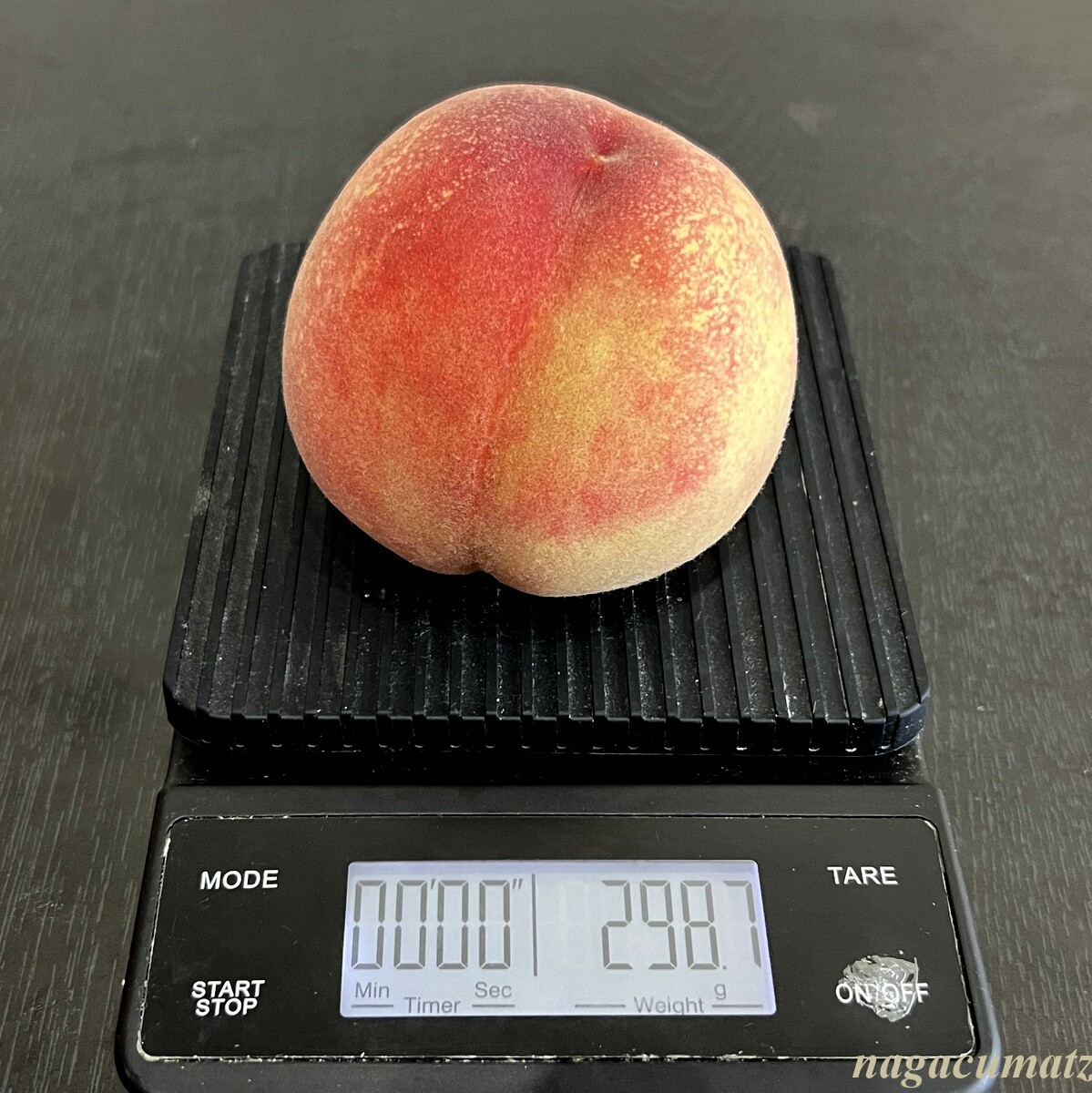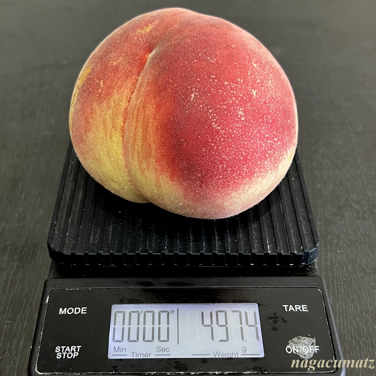 勿論、戦利品は忘れない。品種により収穫時期も異なるそうで、今回は桃の「なつっこ」と言う品種を買うことに。「なつっこ」は長野で「川中島白桃」と「あかつき」を掛け合わせて作られた品種で、現在山梨県が一番収穫が多いとのこと。超特大なるものがあったのでその2個と、他店で一番大きかったもの2個を買ってみることに。超特大は見た目などで難ありとせざるを得なかったものらしいが、1個500グラムと非常に大きい。2個で900円。1個300グラムのものは2個で500円。