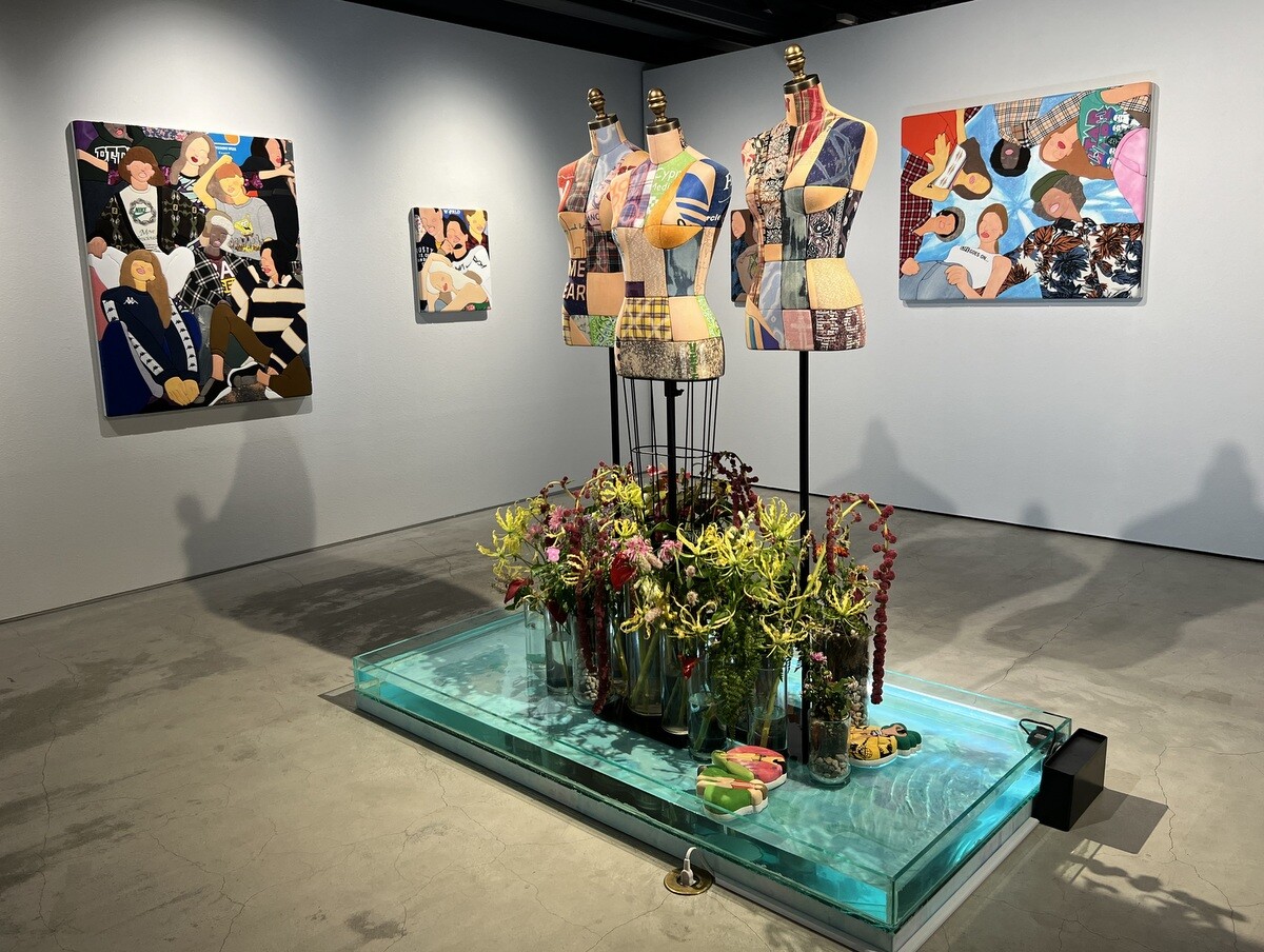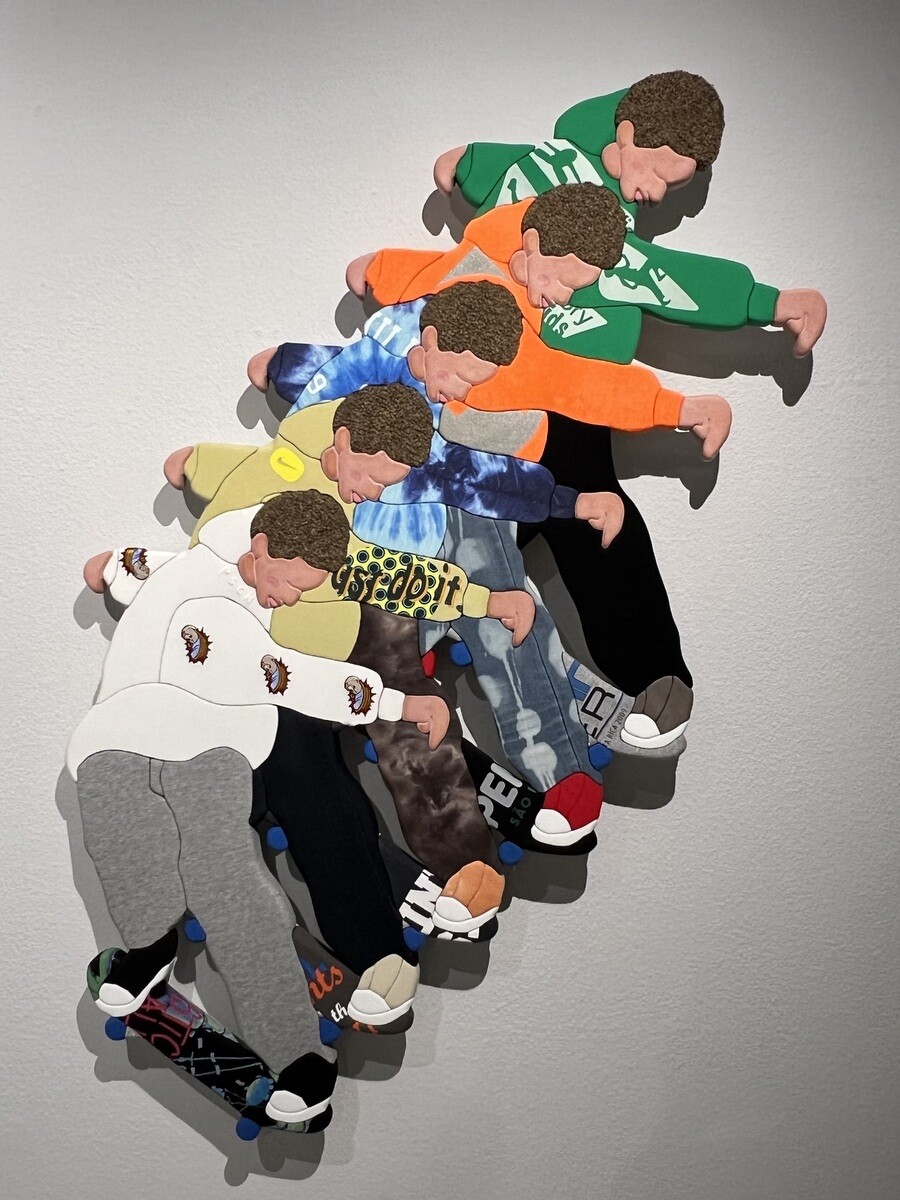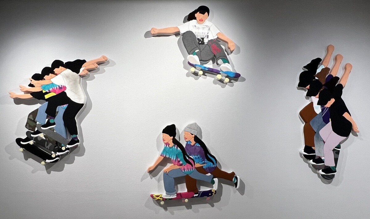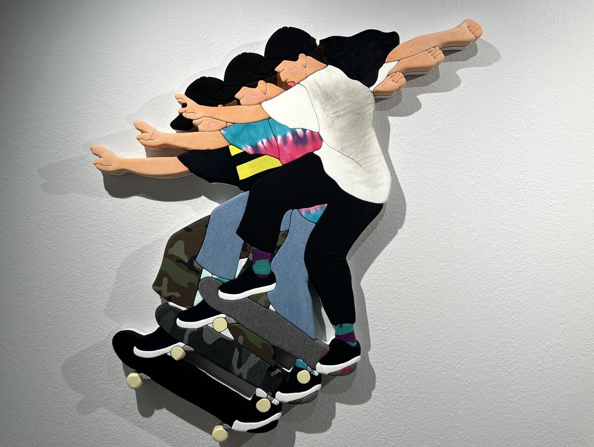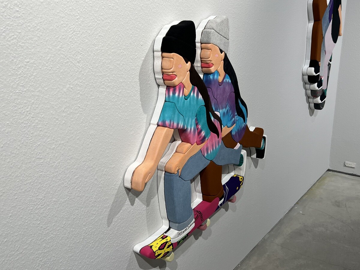 谷敷氏は、幼少期をアメリカで過ごし、帰国後服飾を学んだと言う経歴の持ち主。幼い子供の厄除けの祭具であるひな人形の制作方法として、300年前に江戸で生まれた木目込みの技法で、古着などを使って作品を作っておられる。東京オリンピックのスケートボードメダリストで、谷敷氏とも親交のある中山楓奈(ふうな)選手をモチーフにした作品を含む新作約20点。