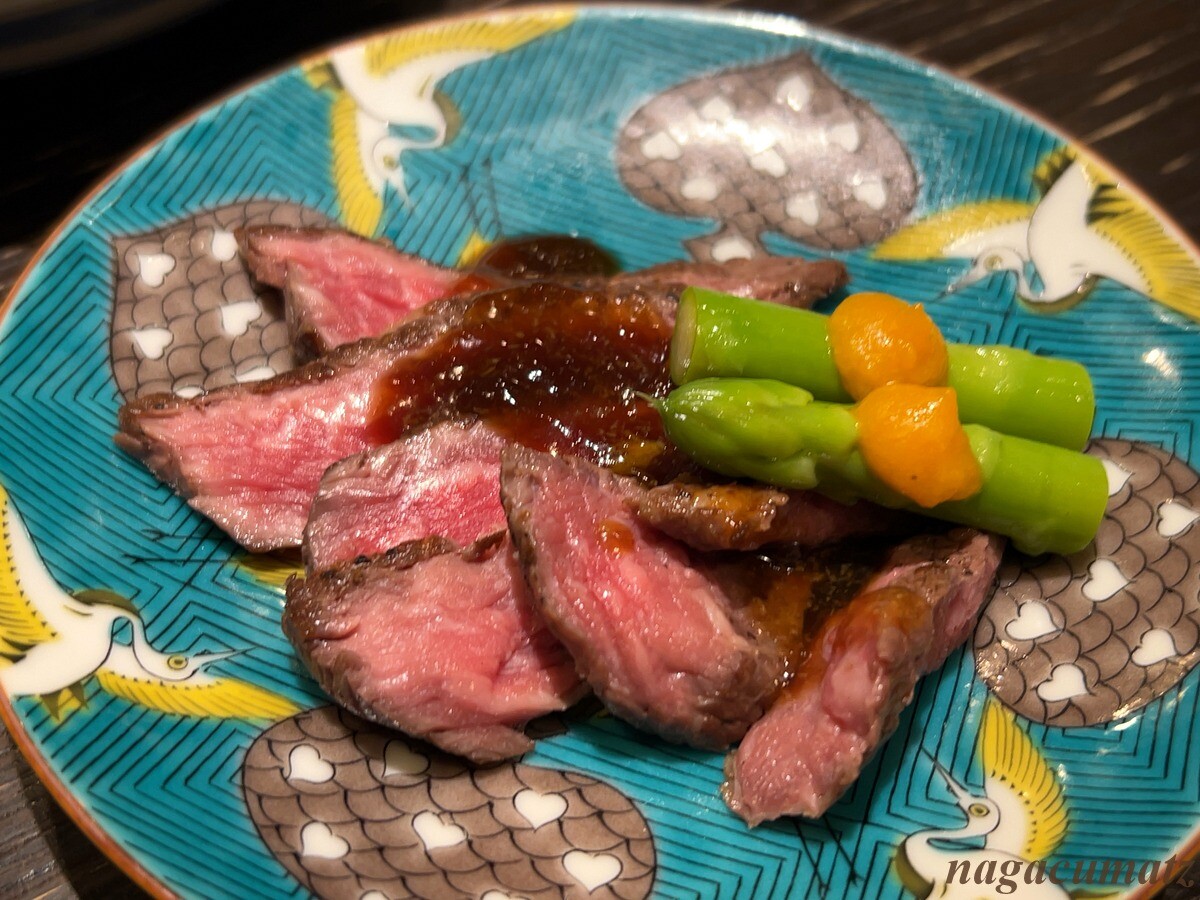 美笑牛のローストビーフ 山葵ポン酢ソース アスパラが付く。1000円