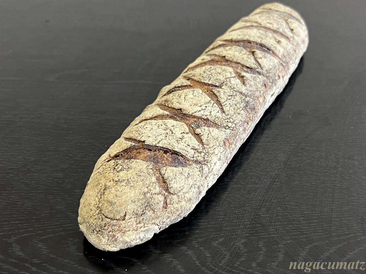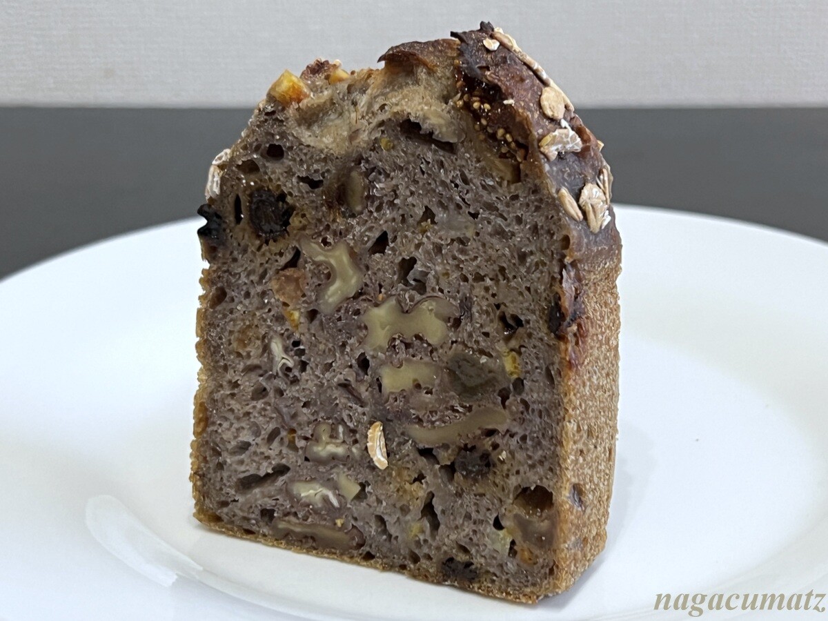 スペルト小麦100%の生地に、くるみ、ヘーゼルナッツ、ピーカンナッツ、イチジク、りんご、カレンズ、サンマスカットレーズン、オレンジピール、日向夏ピールが入っている。もっちりした生地。