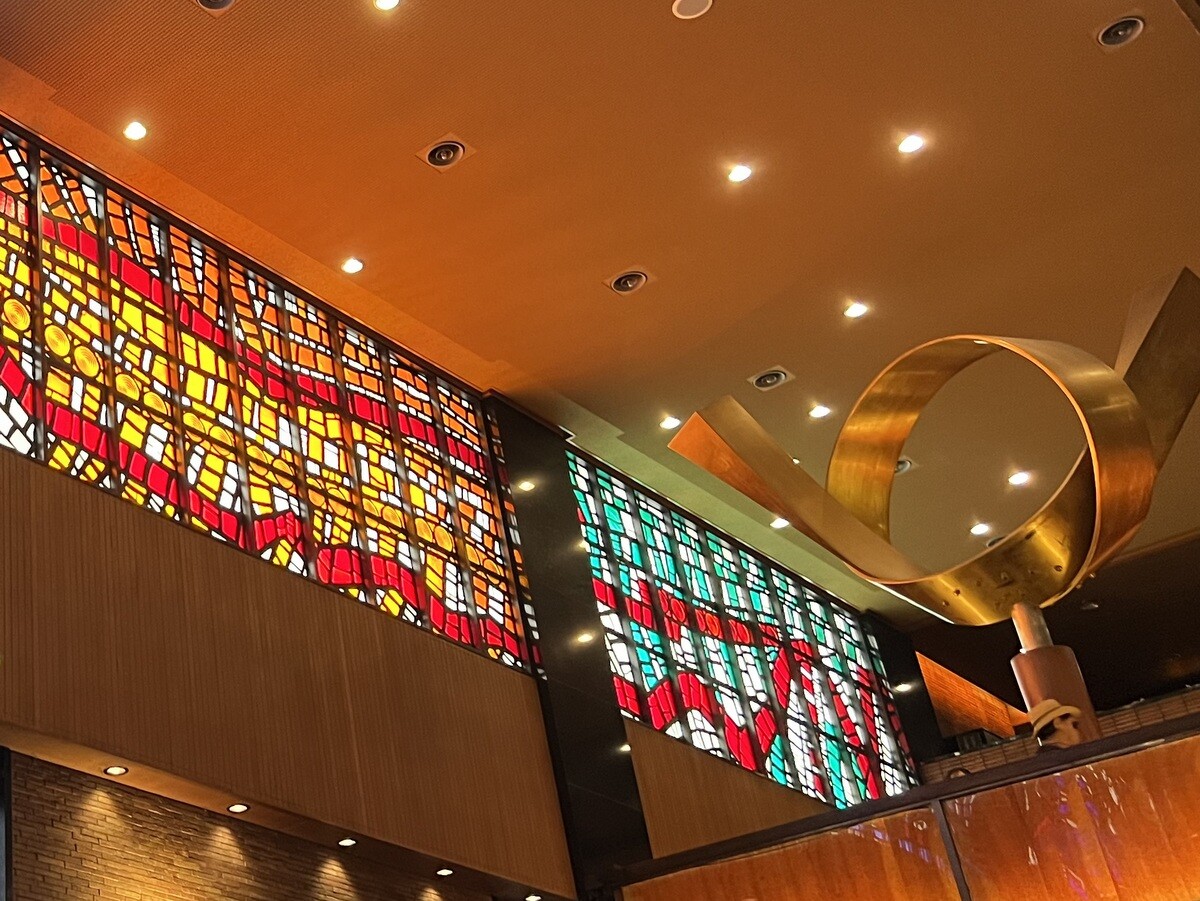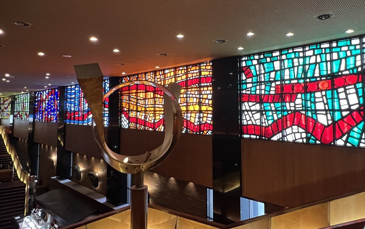 日本のお祭りと舞台を表現した七色のステンドグラス。一面が、高さ2.5メートル、幅6.6メートルで、それが 6面ある。「日本の伝統的な華やかさを、近代的な感覚で演出してみたい。日本のお祭りの色彩とリズムを表現したい。」と、建物を設計した谷口吉郎氏が言ったことから、友人でもあった猪熊氏はステンドグラスとした。