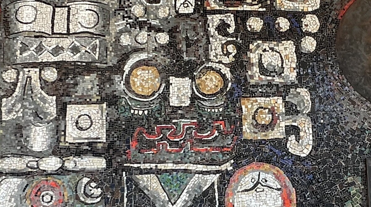 「中米密林の中に繁栄したマヤ文明は正確無比な暦を案出し、文字をもち、数字をもち、ゼロの概念までもっていた。時間に対してマヤほど関心をもった民族はいないといわれる。神殿の壁やステラ(石柱)には記念すべき日時や怪奇な神像が刻まれ謎の記号と表像にみちている。めくるめく太陽、ひろがる虚空、聴明な石の造型、マヤは苛酷な風さの中でとうもろこしの豊色を雨神チャックに乞いねがった。モザイク壁画は秘められた古代マヤ幻想、マヤへのオマーシュである。壁画が天王州の空間に、マヤの神々とともに生を得たことは、天恵の喜びである。」