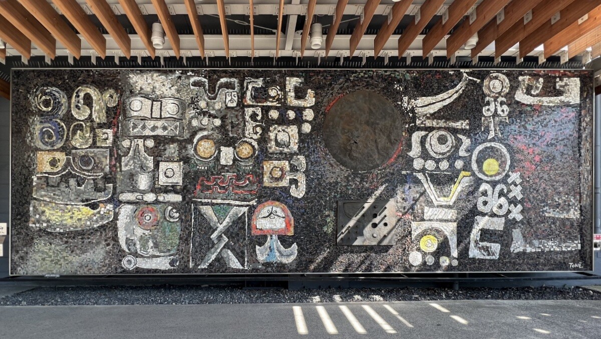 天王洲の寺田倉庫株式会社本社ビルの壁面にある、利根山光人(とねやまこうじん) 氏の「いしぶみ “ISHI-BUMI”」1966。横10メートル超、縦3.5メートル。