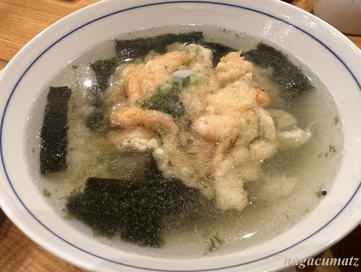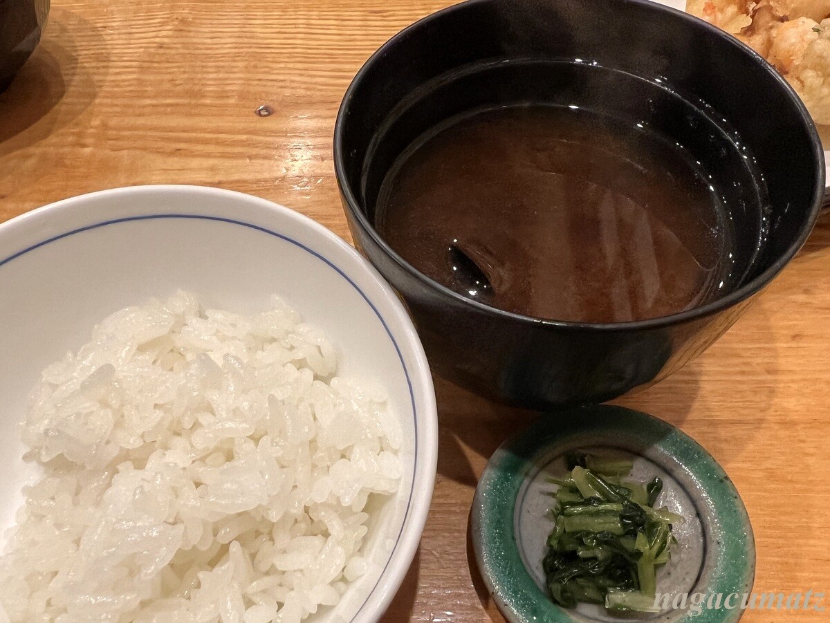 御飯には、しじみのお味噌汁が付く。お茶漬けもお蕎麦もお汁にかき揚げを浸していただくせいか、そのまま塩でいただくかき揚げ御飯のかき揚げは、やや硬い印象。
