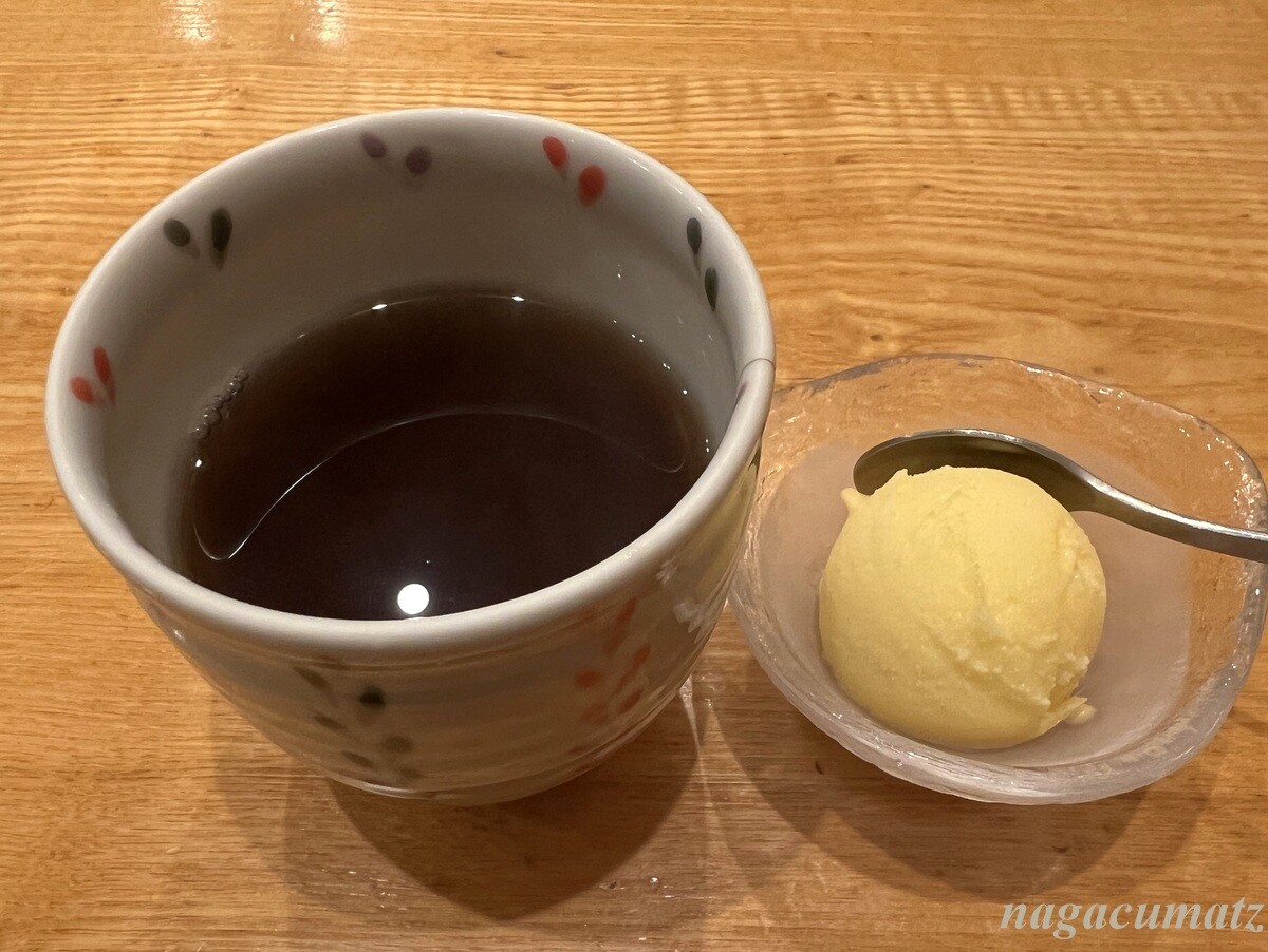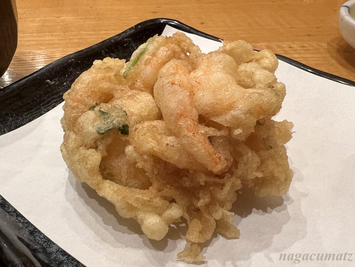 最後お食事には、かき揚げ茶漬け、かき揚げ御飯、かき揚げ蕎麦があるので、茶漬けと御飯を。