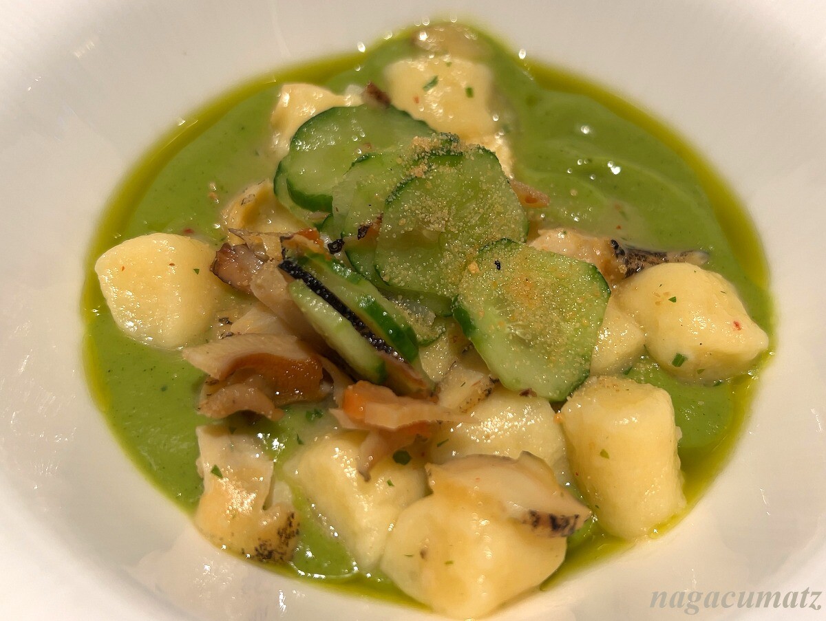 パスタ1品目は、ニョケッティ つぶ貝、ズッキーニ、胡瓜