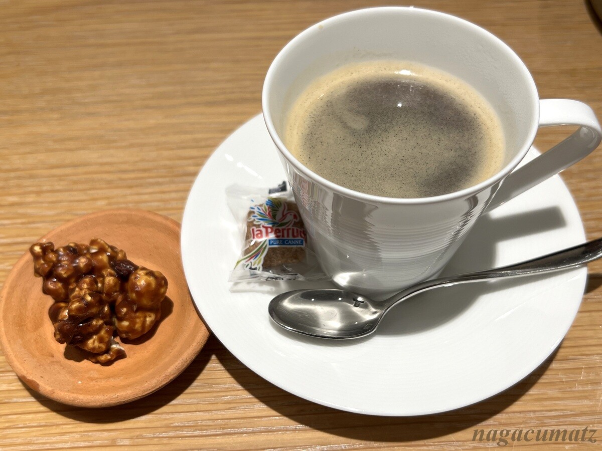 コーヒーは代官山や恵比寿にお店のあるカフェファソン監修のもので、最初はイタリアンなのに薄い?と思いきや、温度が下がって来るに従って、柑橘の酸味やベリーのふくよかさのような風味が出て来た。キャラメルポップコーンと共に。