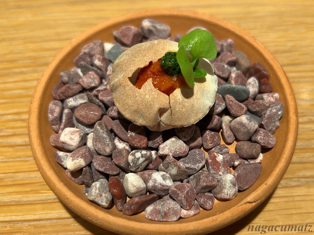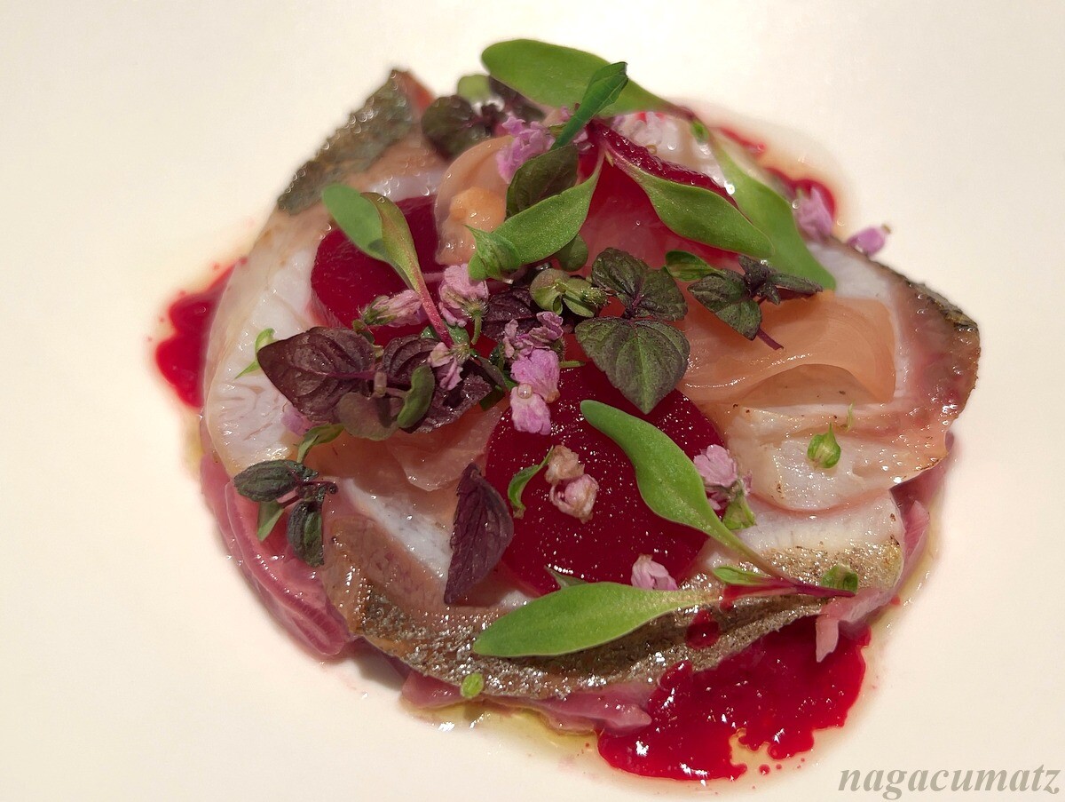 炙ったシマアジの下には、マスカルポーネと赤タマネギを和えたものが敷かれ、鰹と浅蜊でとった出汁のジュレや、ビーツ、酢漬け生姜、花穂紫蘇、などが載る。シマアジの燻製香が良い。