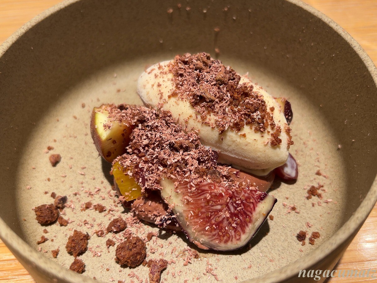 とよみつひめと、黒いちじくのビオレソリエスだったかなぁ。下には、アマゾンカカオのムース、カットしたオレンジ、そして上にはイチジクとラムレーズンを合わせたアイスクリームが載る。このアイスクリームが秀逸。全体を通してもおても美味しい。
