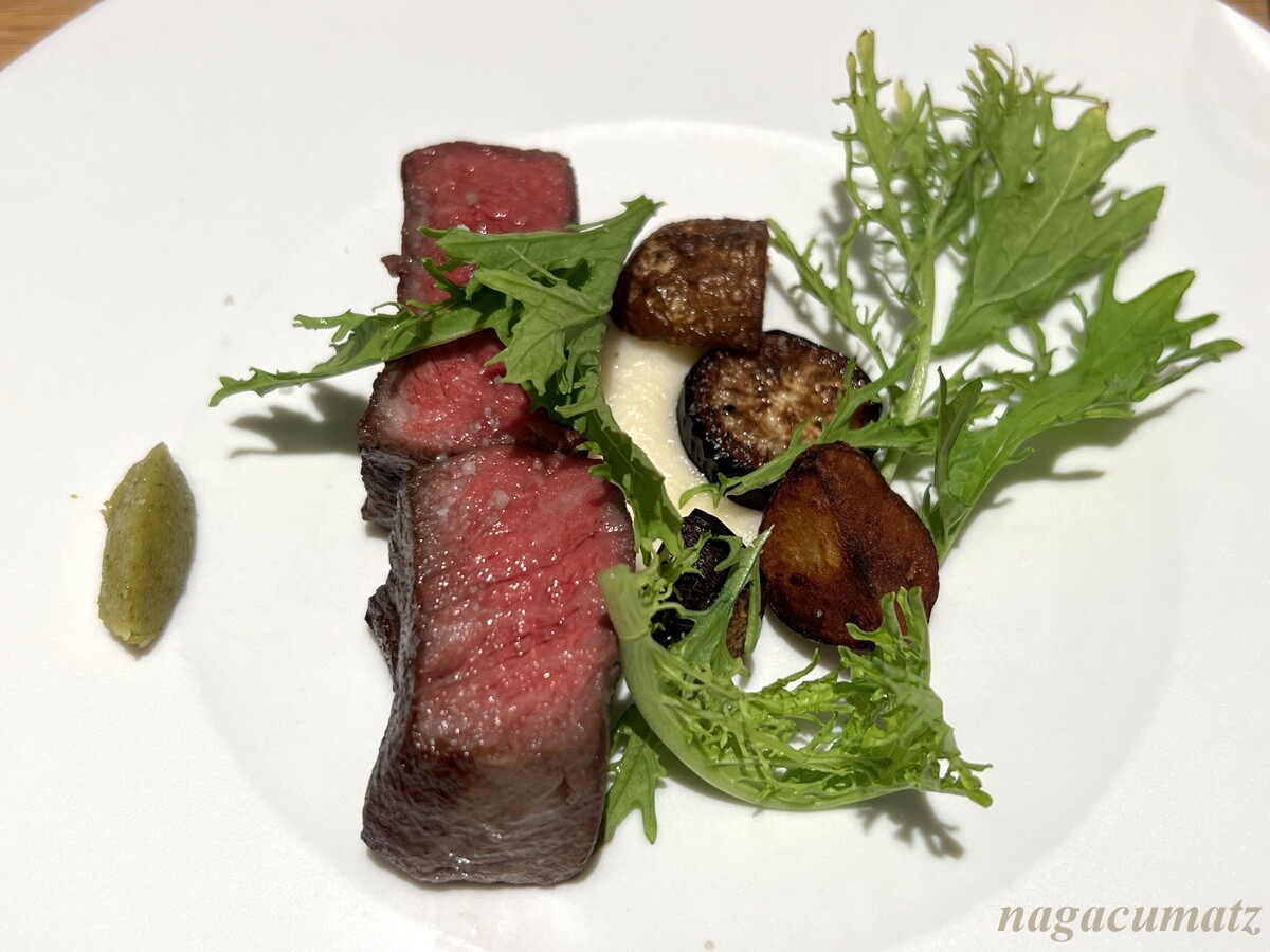 お肉料理は3種類(丹波黒どり、ガリシア豚、松坂大石牛)からの選択で、特産松坂大石牛の炙りを。1500円×2人分増