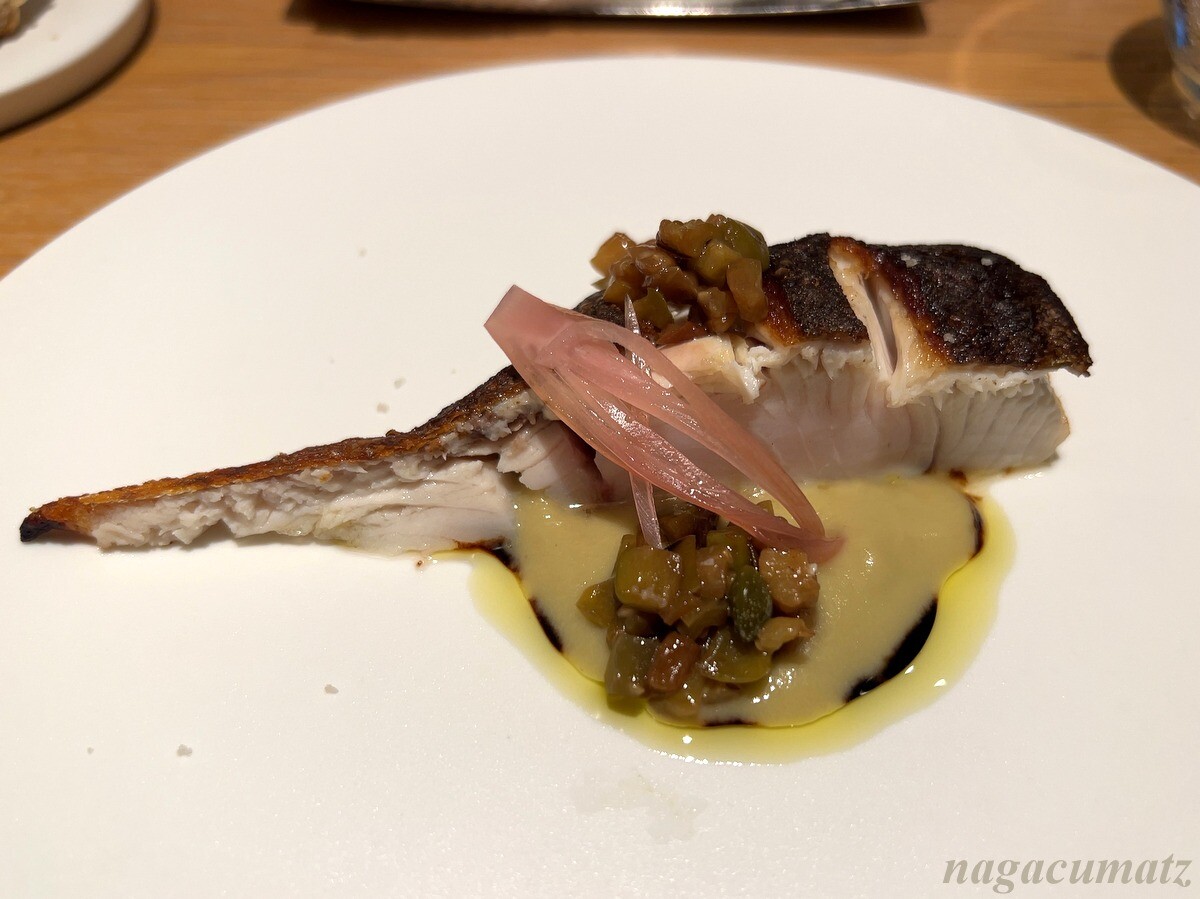 本日の鮮魚はカンパチ。皮目をパリッと焼いて、身の中心部分はピンク色。ケッパーなど、酢漬けの茗荷が載り、ソースは茄子のペースト、オリーブオイル、バルサミコがソースとなっている。