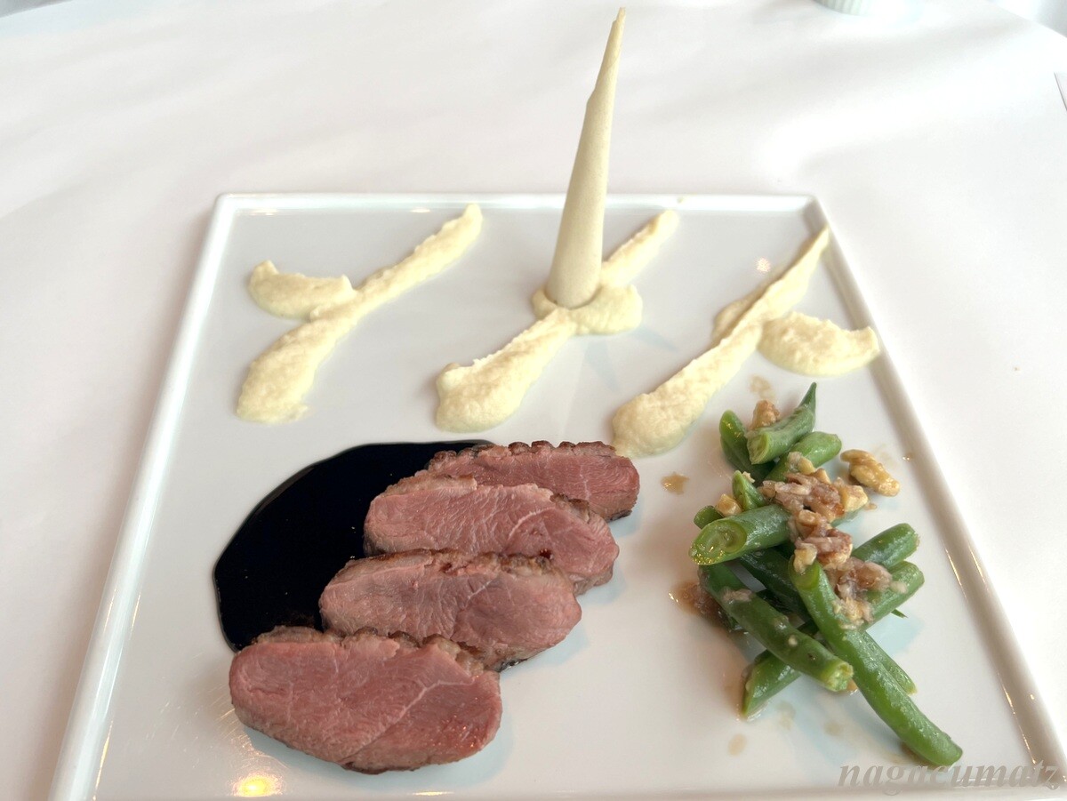 マグレのロースト 根セロリのピューレとインゲンと胡桃のサラダ スパイスの香る赤ワインソース