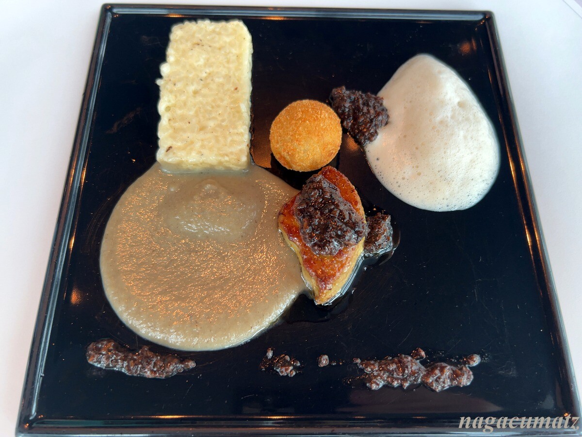 鴨フォアグラのポワレ パルメザンチーズのリゾットと牛蒡のピューレ モリーユ茸のソース