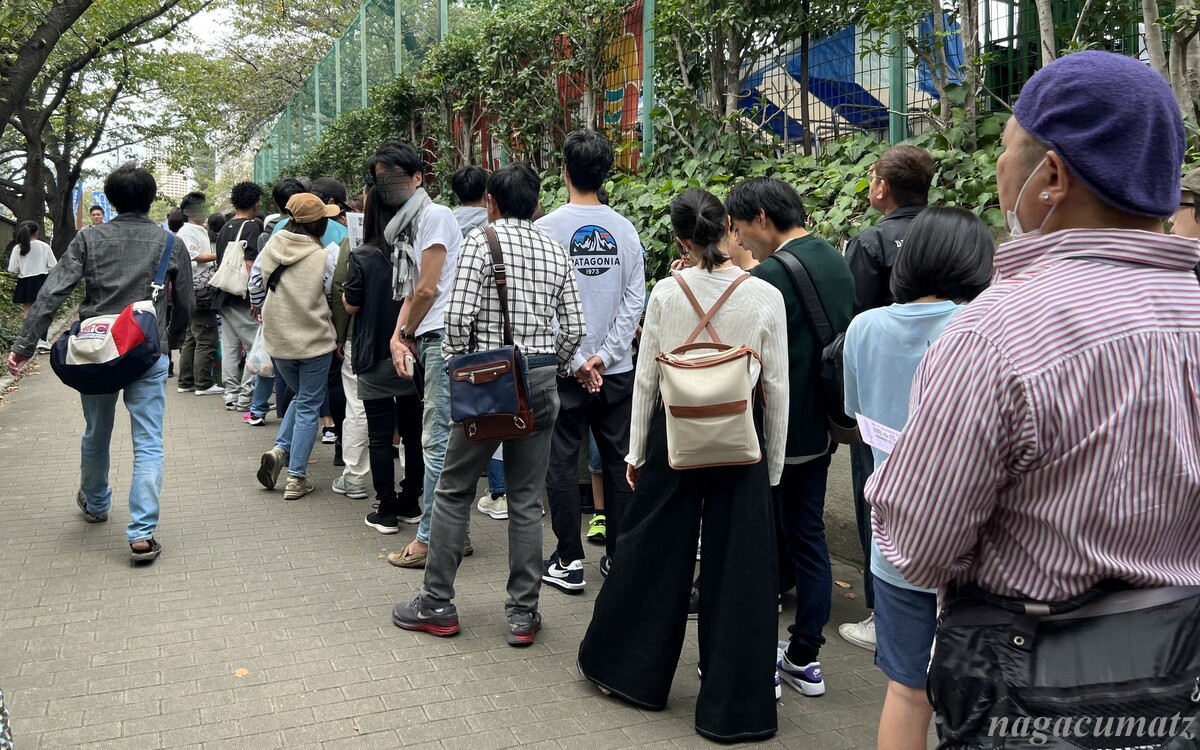 会場となっている田道広場公園から目黒川沿いにずらーっと人の列が続いていたのだが、当日分のさんまを食べたい方々の列! 予めチケットのある人達は13時までに行くことになっていて、待っておられる方々は13時以降に食べることになるのだろうが、我々が通りかかった12時頃で相当長い列だったので、先頭の方はいったい何時から待っておられたのだろうか。。。
