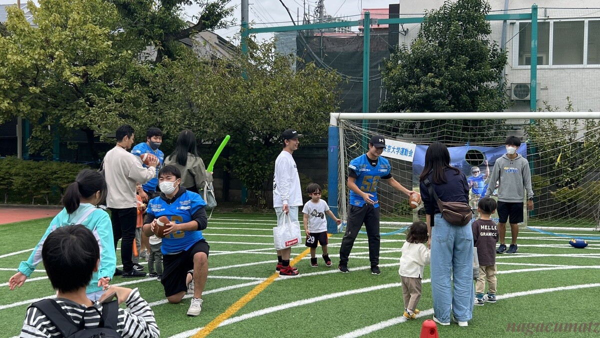 目黒区に位置する東京大学駒場キャンパスの学生さん達により、子供向けに段ボールで作った迷路やキャタピラーなどの遊具があったり、アメフト部の学生さん達が紹介していた。