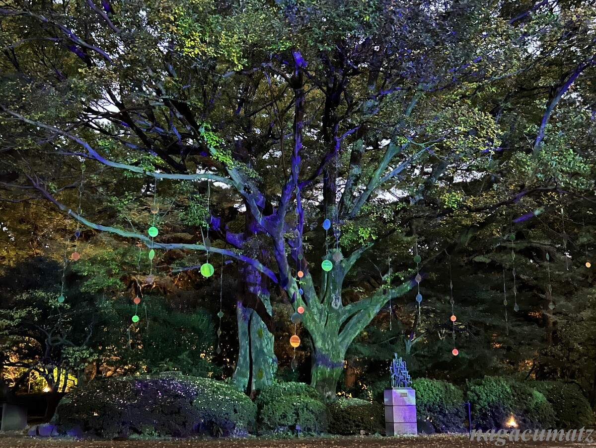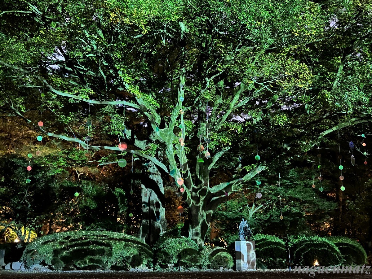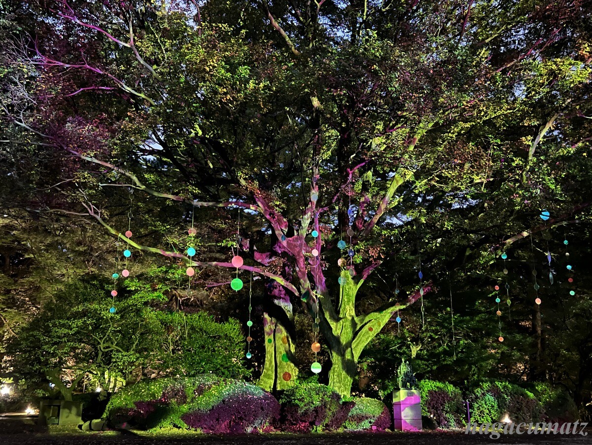 庭園内のムクノキは、芝庭のシンボルツリー。その木を祝の紙吹雪のようにモビールで飾り付け、プロジェクションマッピングを日没後から見ることができる。
