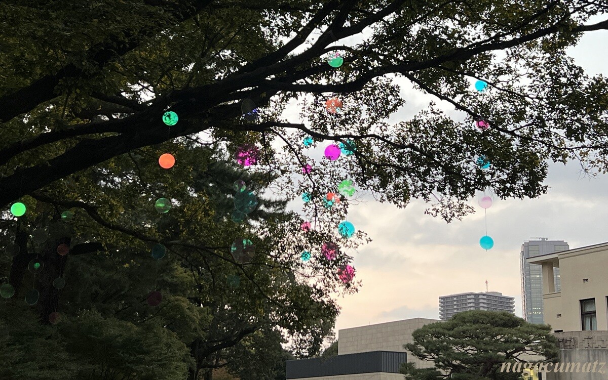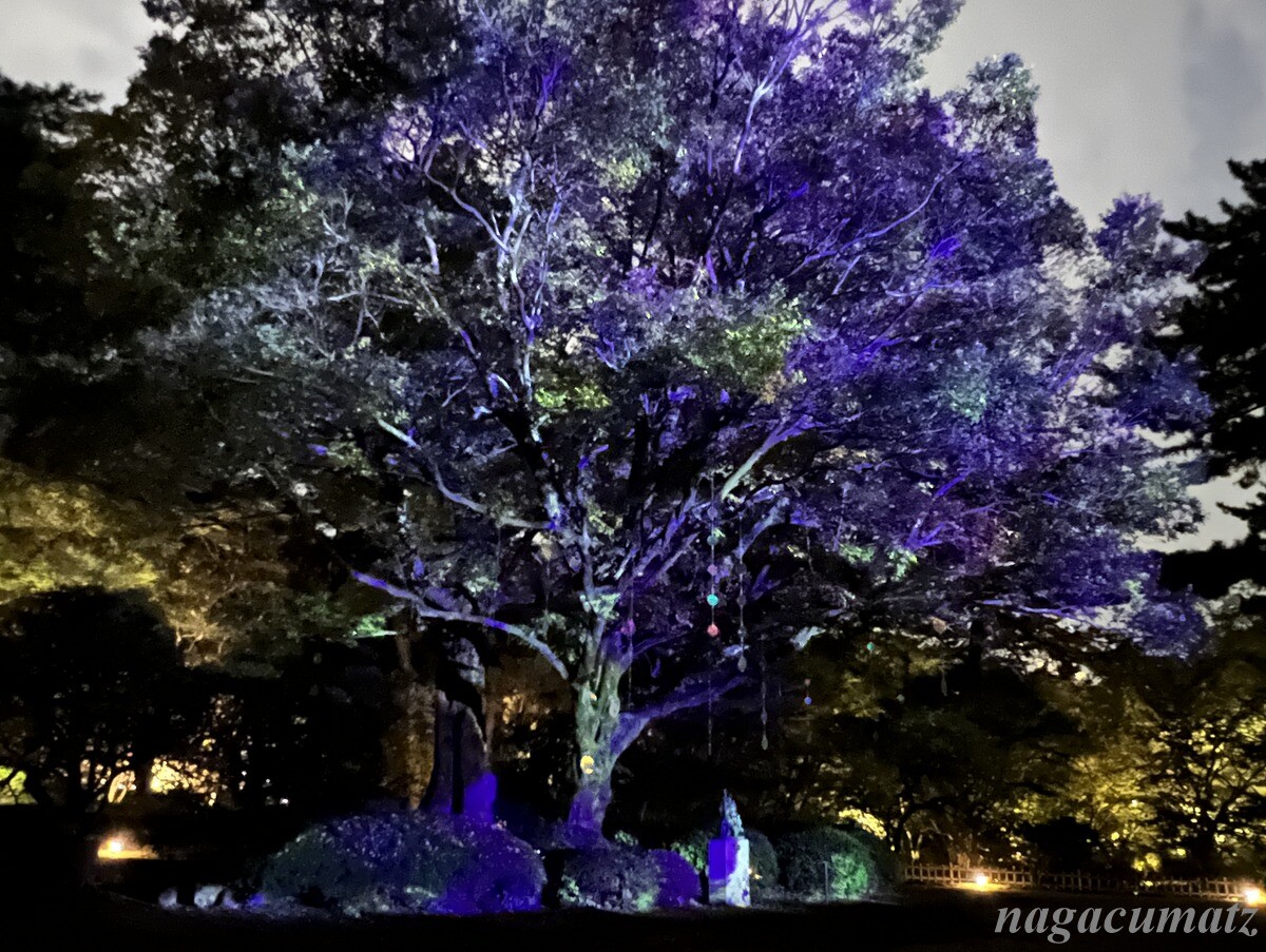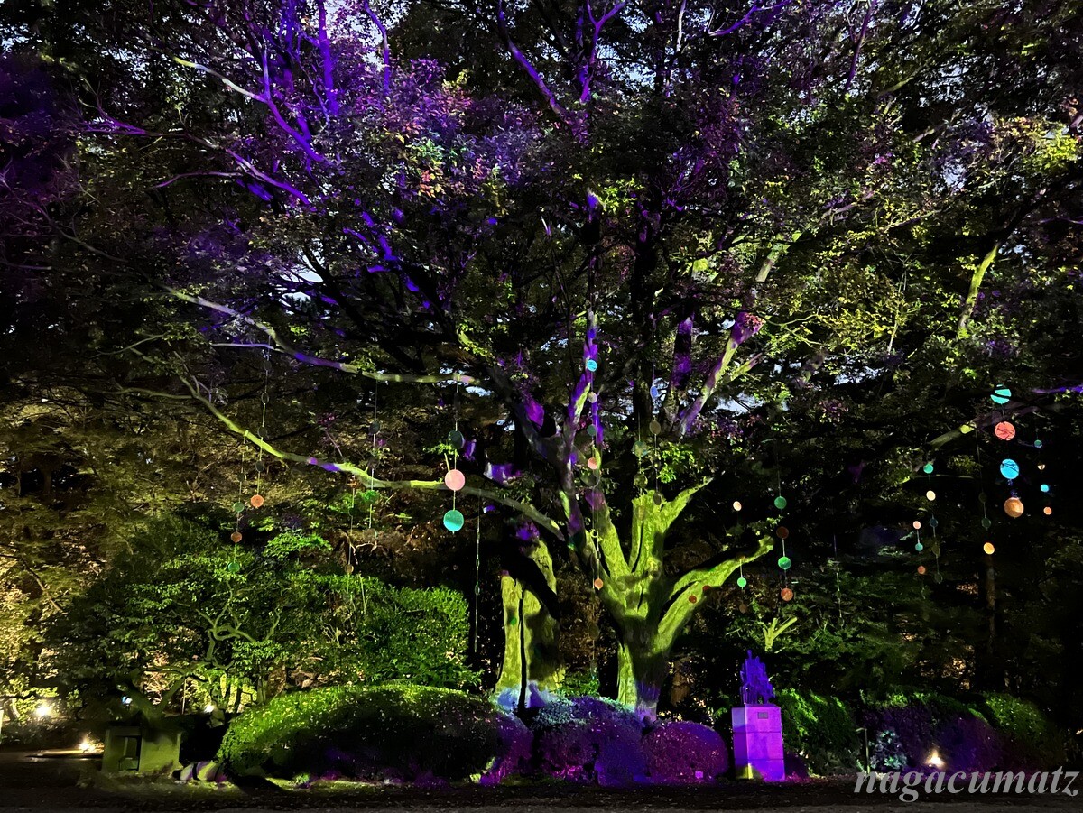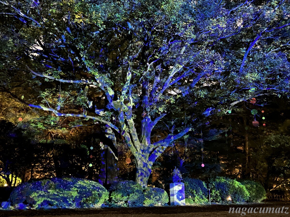 庭園内のムクノキは、芝庭のシンボルツリー。その木を祝の紙吹雪のようにモビールで飾り付け、プロジェクションマッピングを日没後から見ることができる。