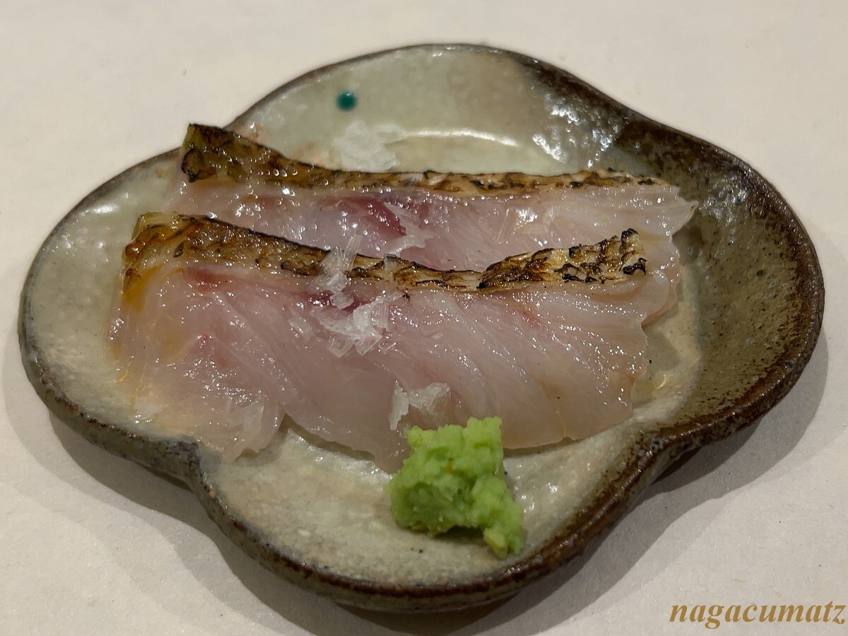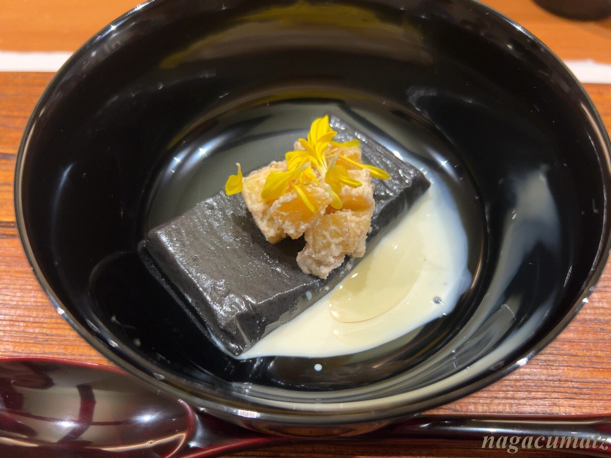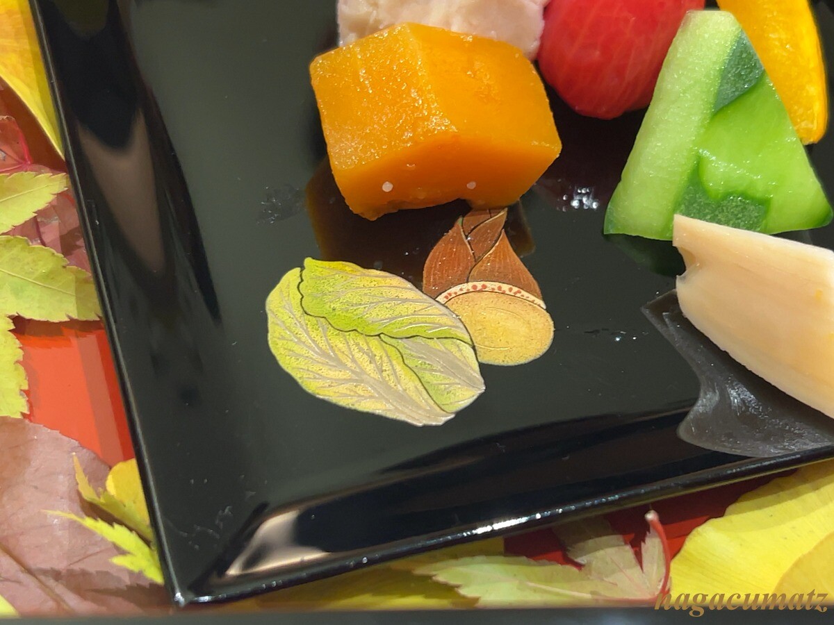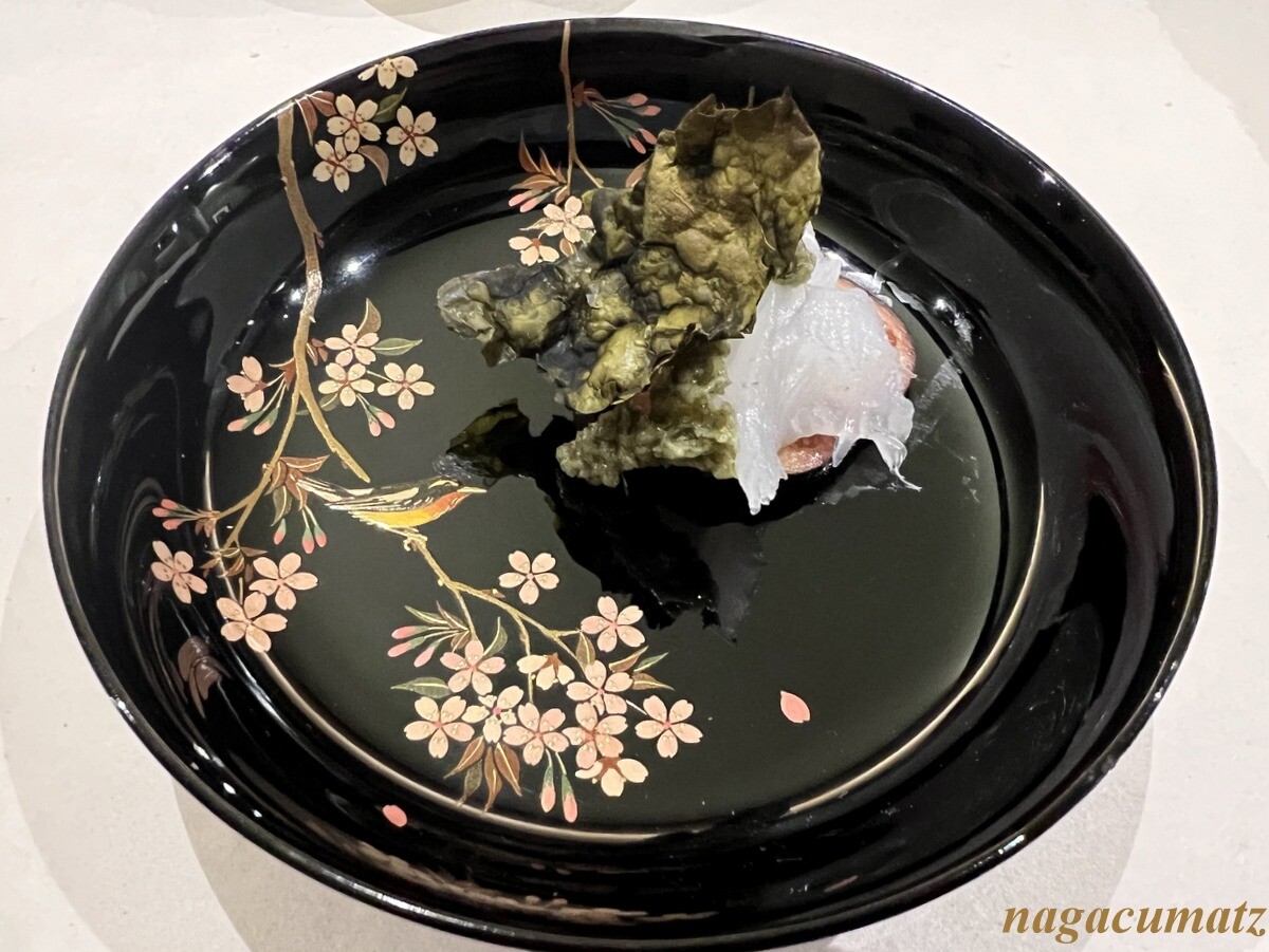 アオリイカ、昆布とオリーブ、上には炭火焼きのワカメ、下にはイチジク。桜の上にキビタキが一羽いるが、食べ終えるとその下にももう一羽。この器は、胡麻豆腐の器の蓋だったのだそう。