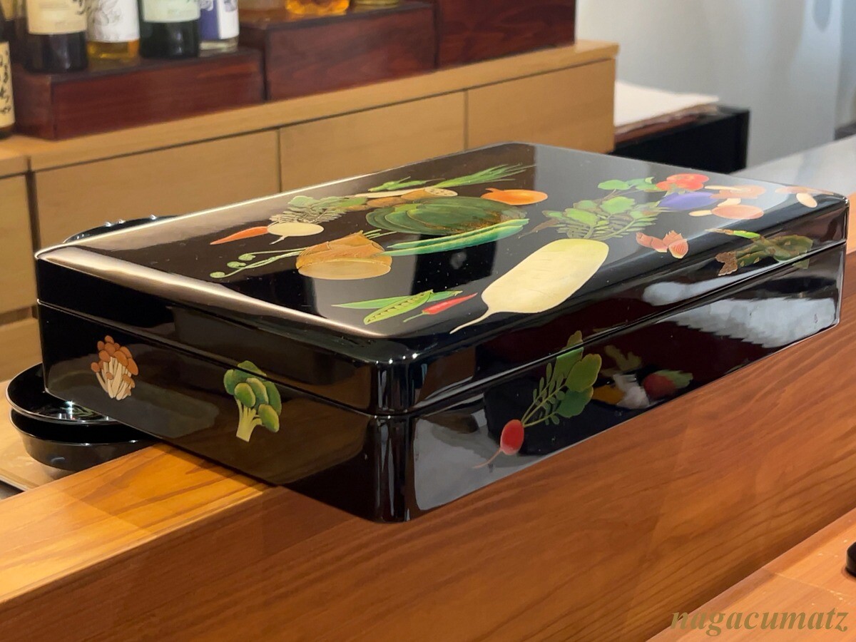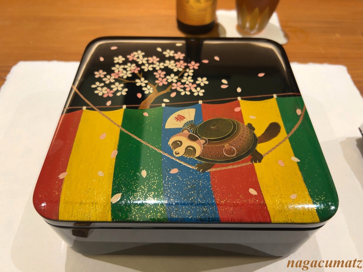 お重が運ばれてくるが、我々には春・夏のバージョンで、お隣のお客さんお二人には秋・冬バージョンだっが。蓋の裏も可愛い。