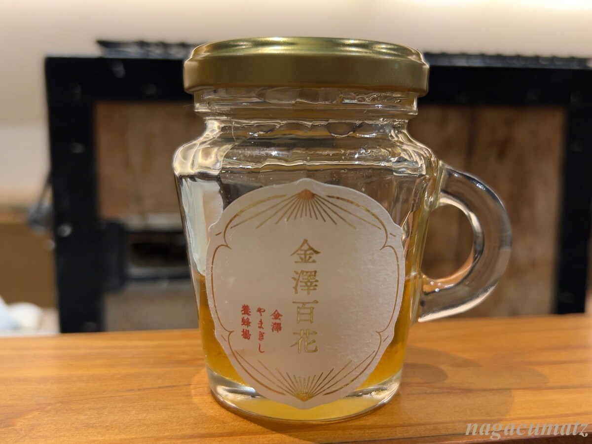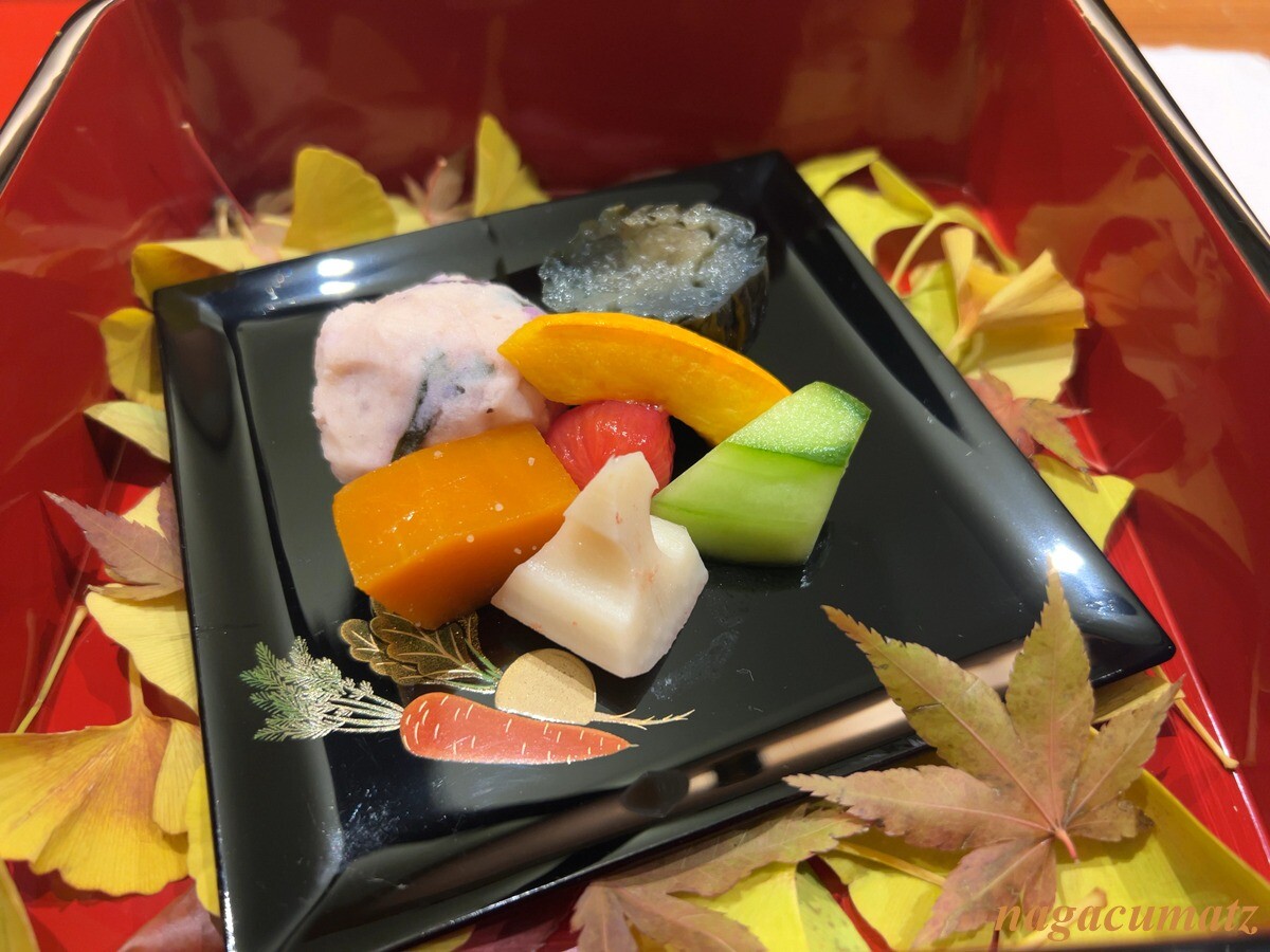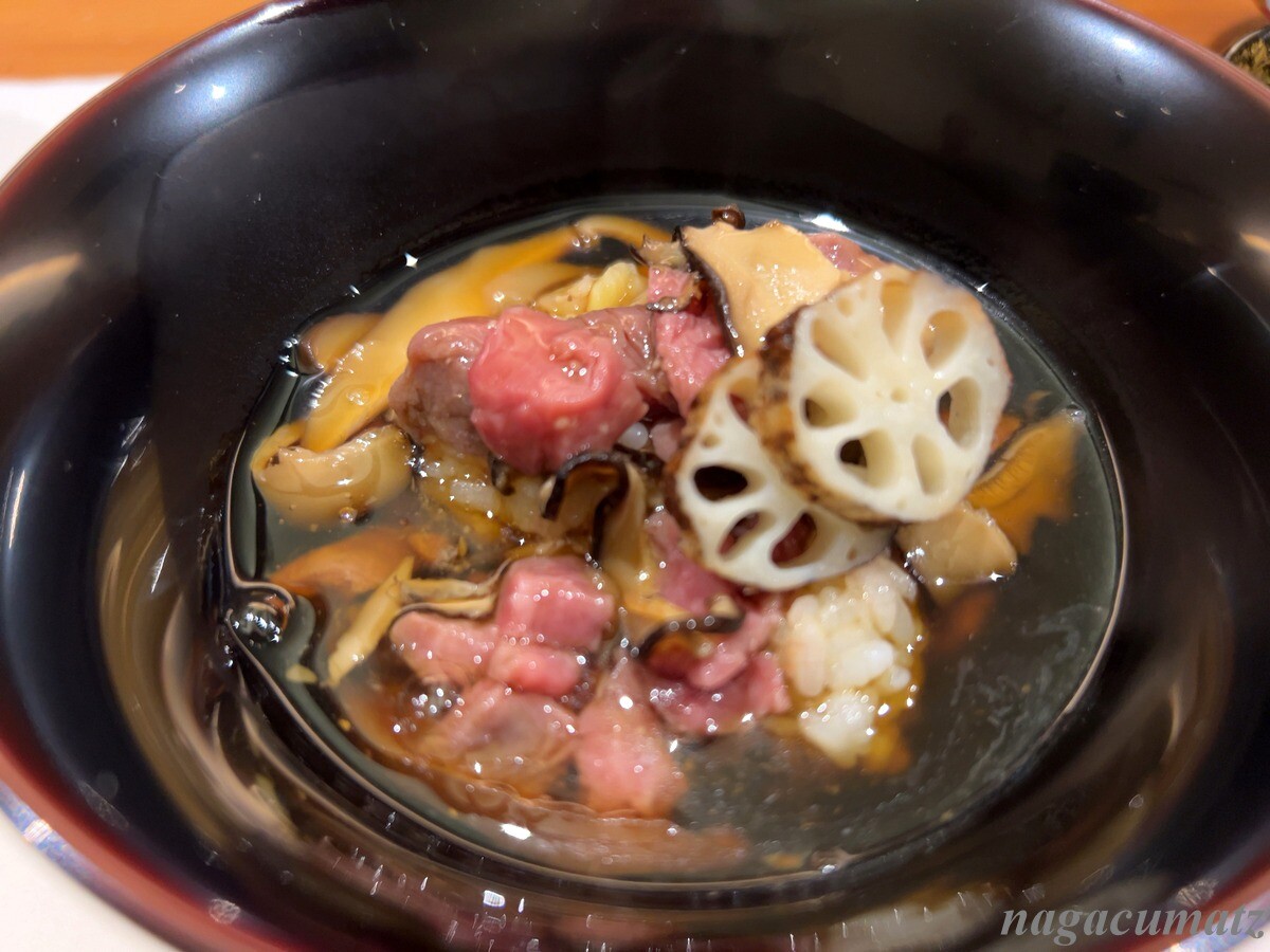 能登牛や小松の猪などやブルーベリーが入った治部煮は、伝統的な治部煮ではなく、さらっとあっさり系。下には栗おこわが入っていて美味しい。