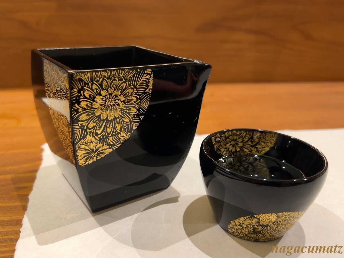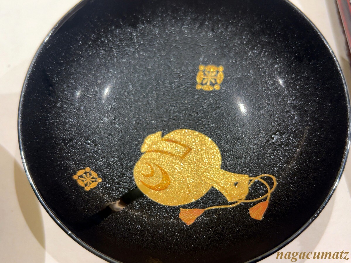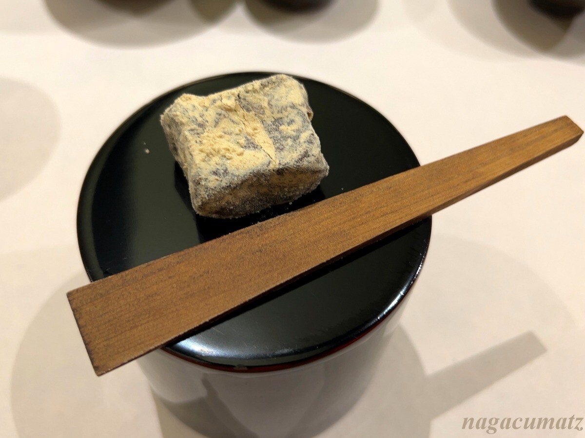 生チョコレートは、漆のヘラでいただくのだが、漆を塗る際の漆の硬さとチョコレートの硬さを同じにしているとのこと。チョコレートの台は、ちゃんと底まで綺麗な漆が塗られているからと、入れ物をひっくり返した底部分。
