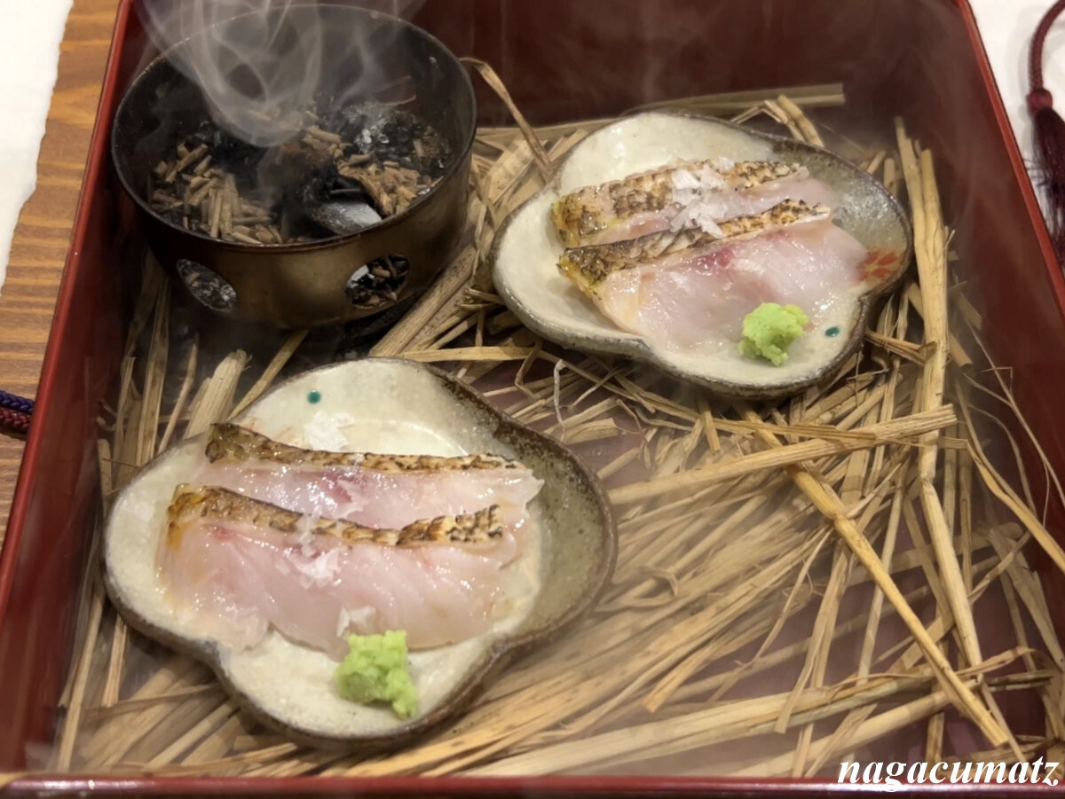 ノドグロは、棒茶による燻製で、お重の蓋をその場で取ってもらうと、うわーっと棒茶の燻製の煙があふれて来る。