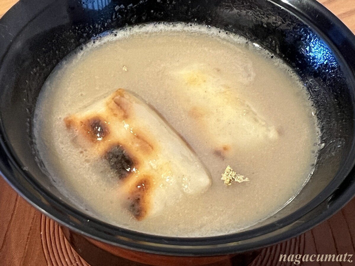 金箔が浮いている中にお餅を投入! 底には栗がごろんごろんと入っていた。