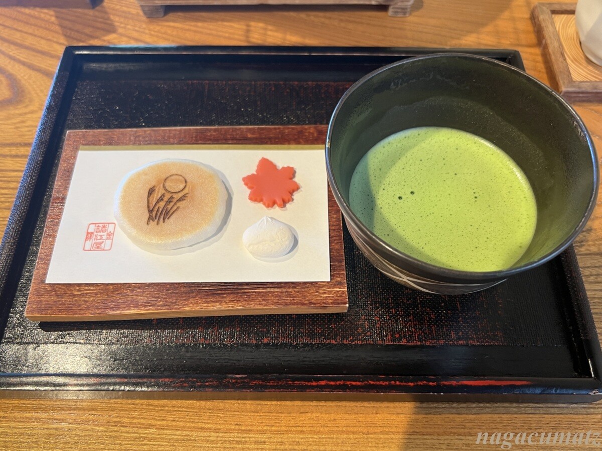 赤い紅葉は柔らかい州浜、大きな焼き菓子は麩菓子。