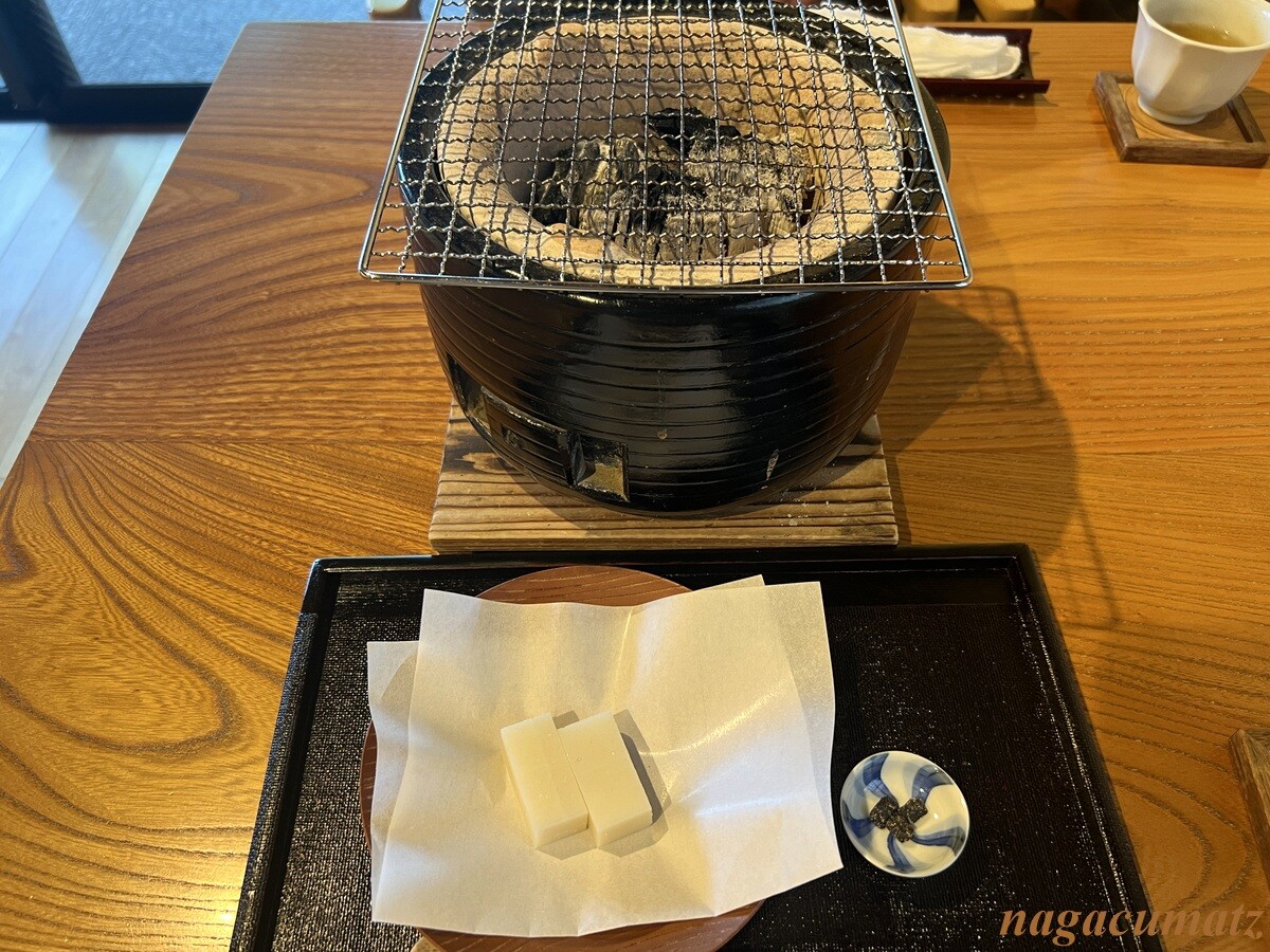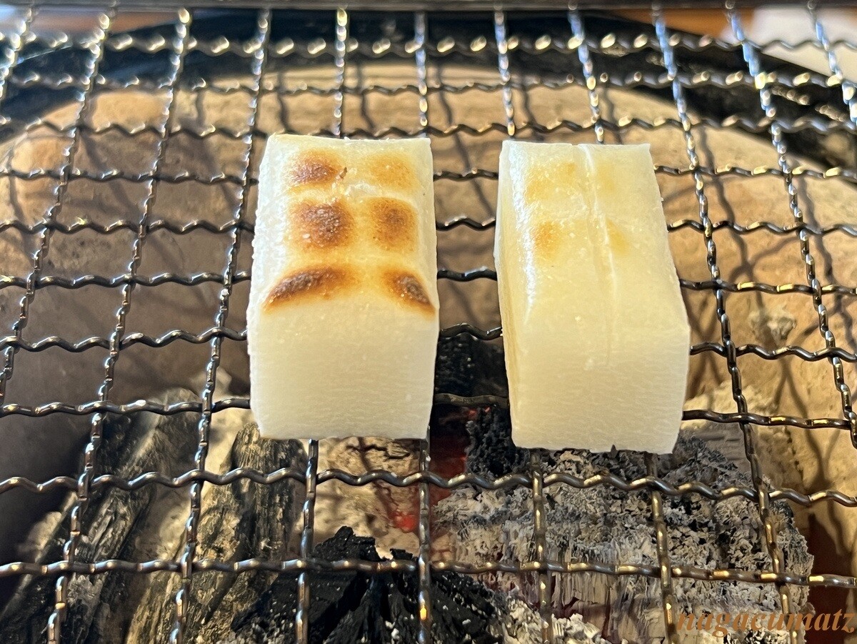 赤く熾った炭で、自分でお餅を焼いて、おしるこの中に入れていただく。塩昆布が付く。