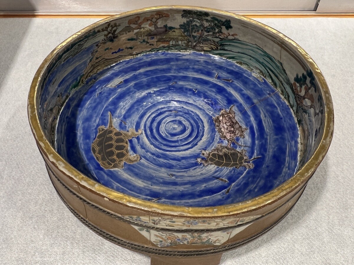 九谷庄三 江戸時代末期「色絵山水亀図馬盥(かん)形水盤」