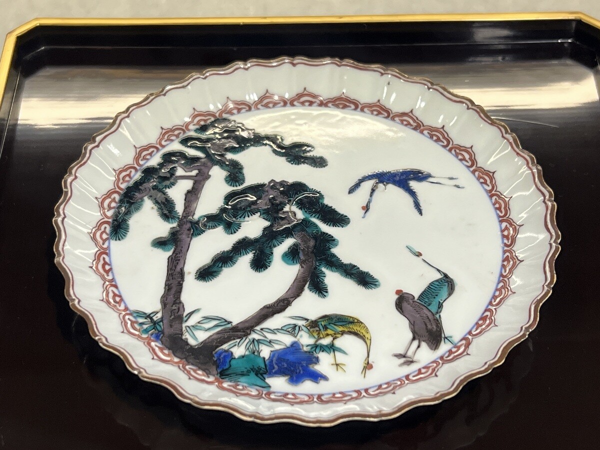 古九谷 江戸時代前期「色絵松鶴図輪花中皿」